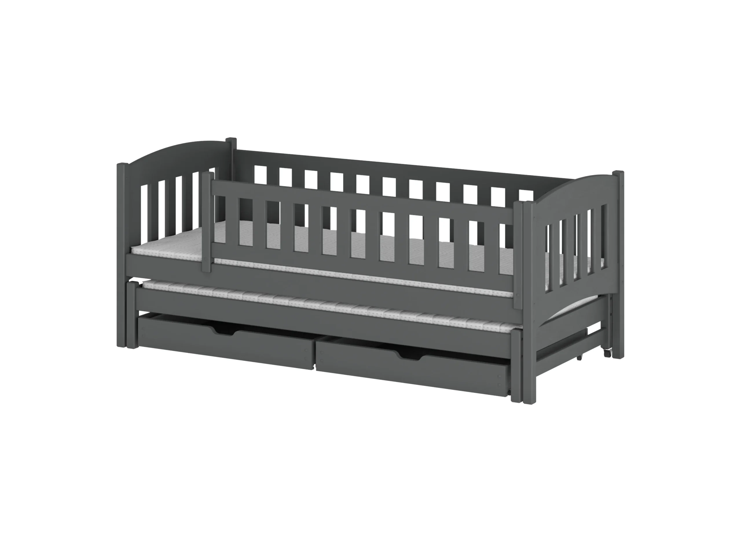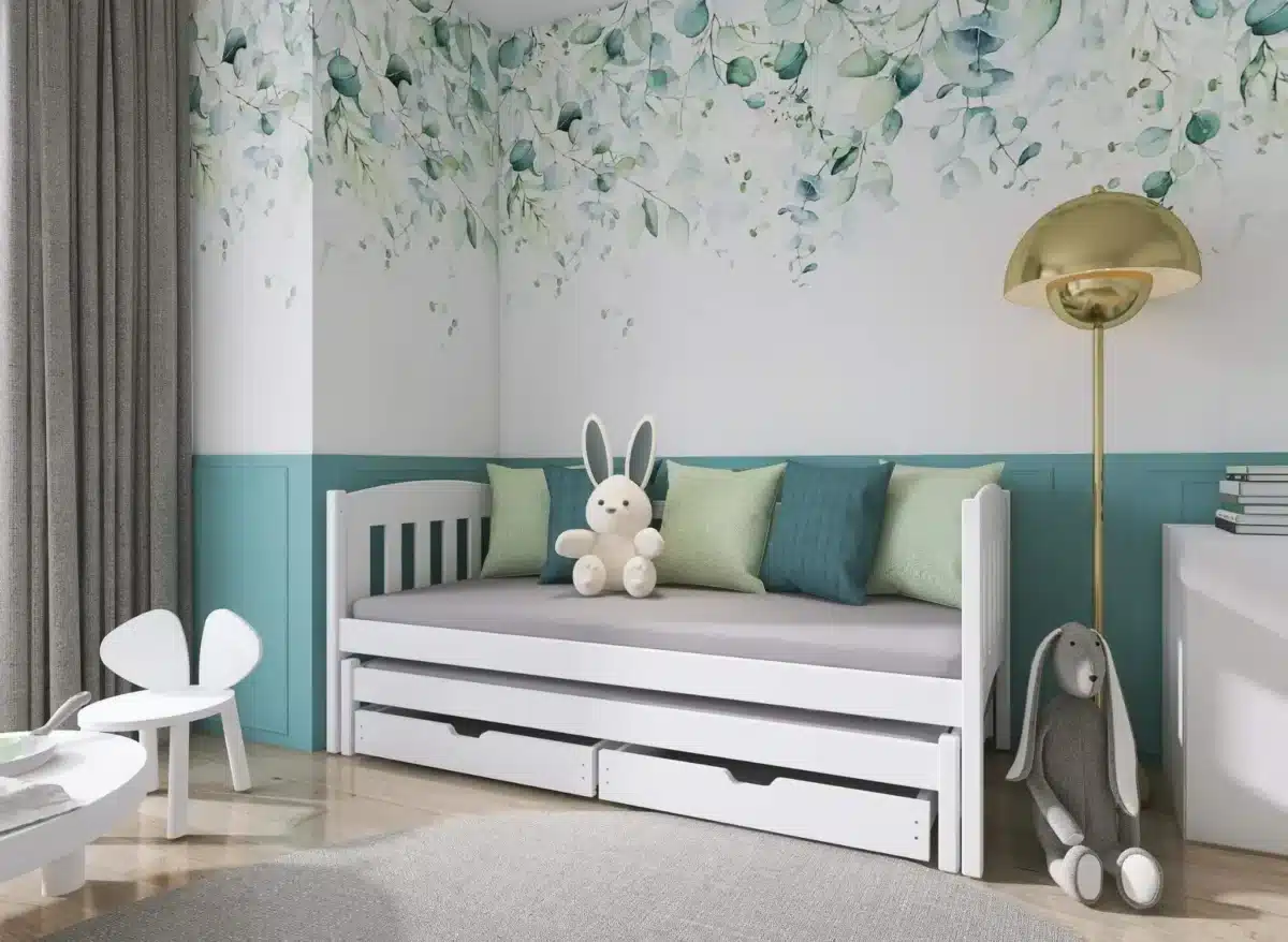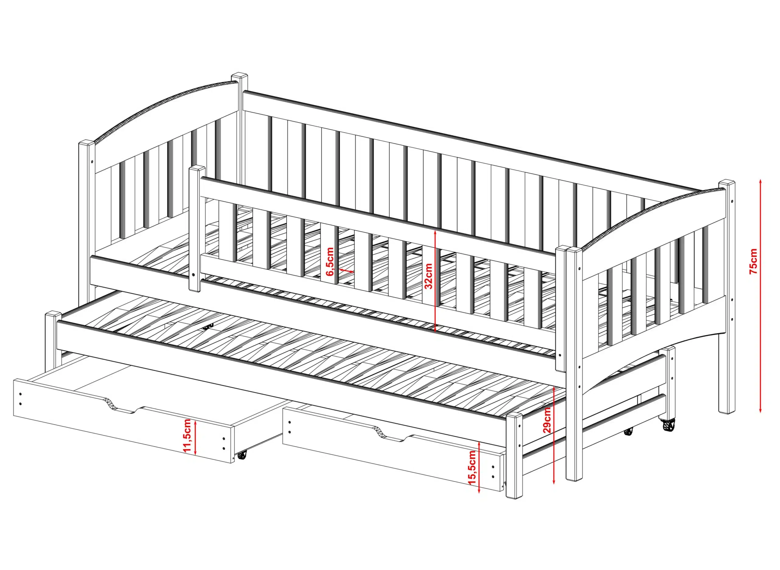 V detskej izbe je síce šatník alebo samostatná šatňa, no ďalší úložný priestor určite nezanedbáte – obzvlášť v malej izbe. Detská posteľ AMALKA má dva výsuvné šuplíky . Čo v nich môžete ukryť? Veci, ktoré chcete mať po ruke – ako extra vankúše alebo teplú prikrývku na prikrytie vášho bábätka v chladnej noci. Dizajn postele AMALKA však zaujme nielen výsuvnou spodnou posteľou, na ktorej môže spať druhé dieťa. Konštrukcia bola tiež navrhnutá s ohľadom na maximálnu bezpečnosť detí. Hlavná posteľ je obohnaná vysokým zábradlím , vďaka ktorému sa vaše dieťa neprekotúľa na osobu spiacu pod ním. Obe úrovne spánku sú nastavené tak nízko, že pád na zem nebude bolestivý – ak sa rozhodnete odstrániť bočnice pre staršie dieťa.