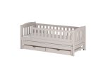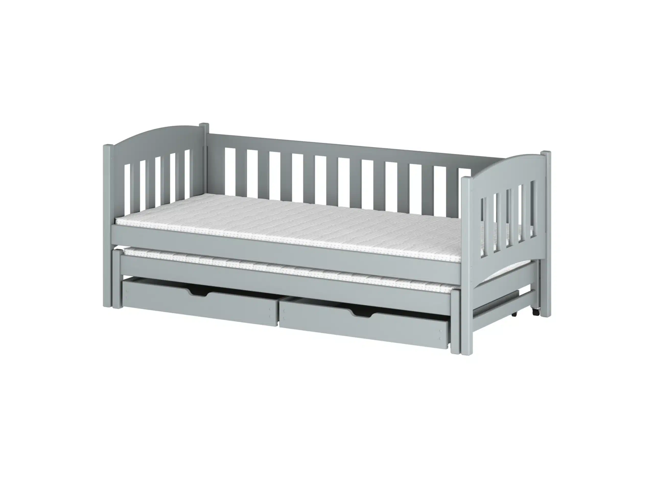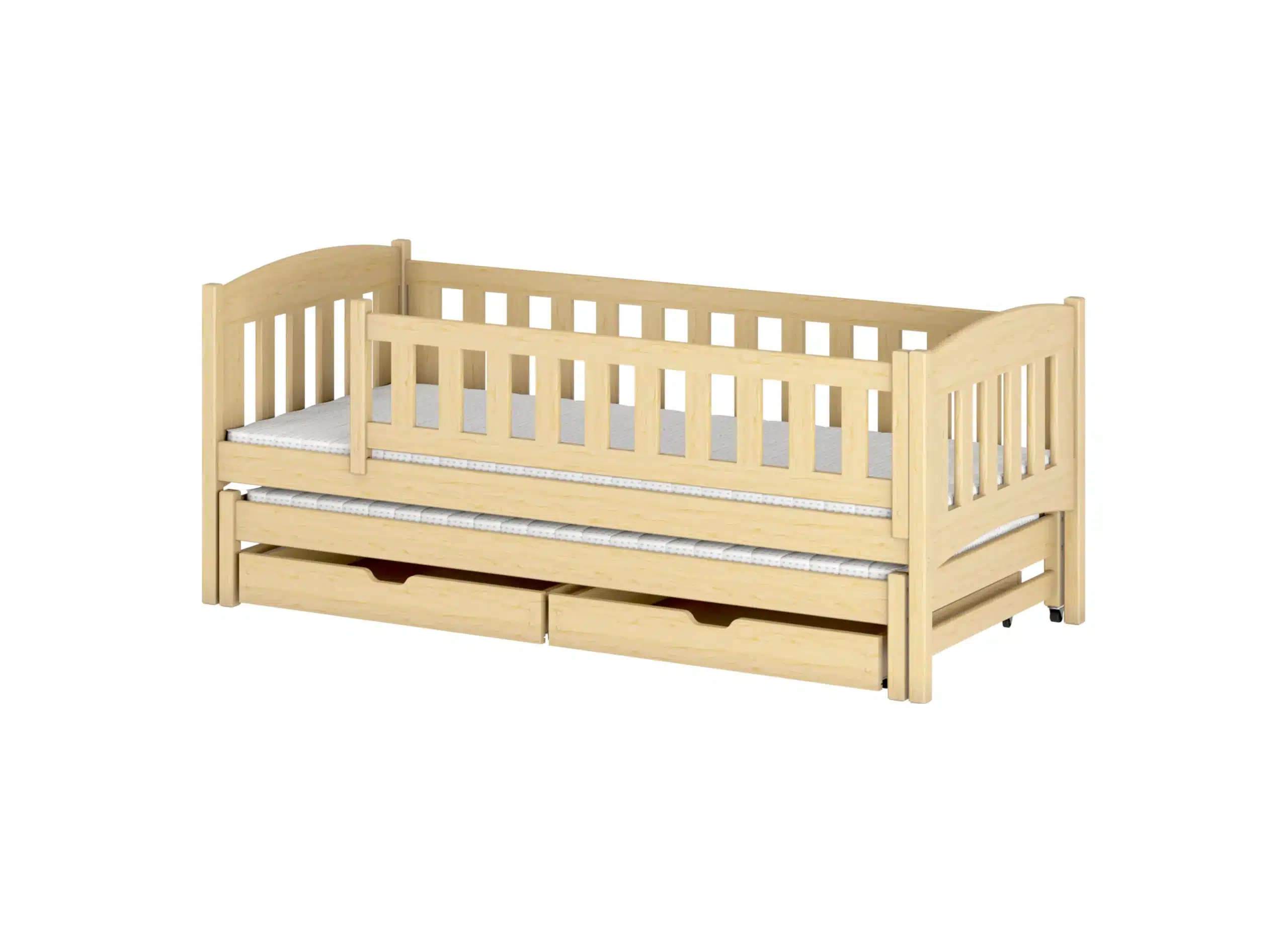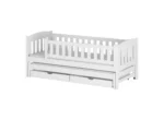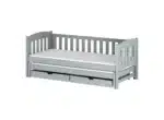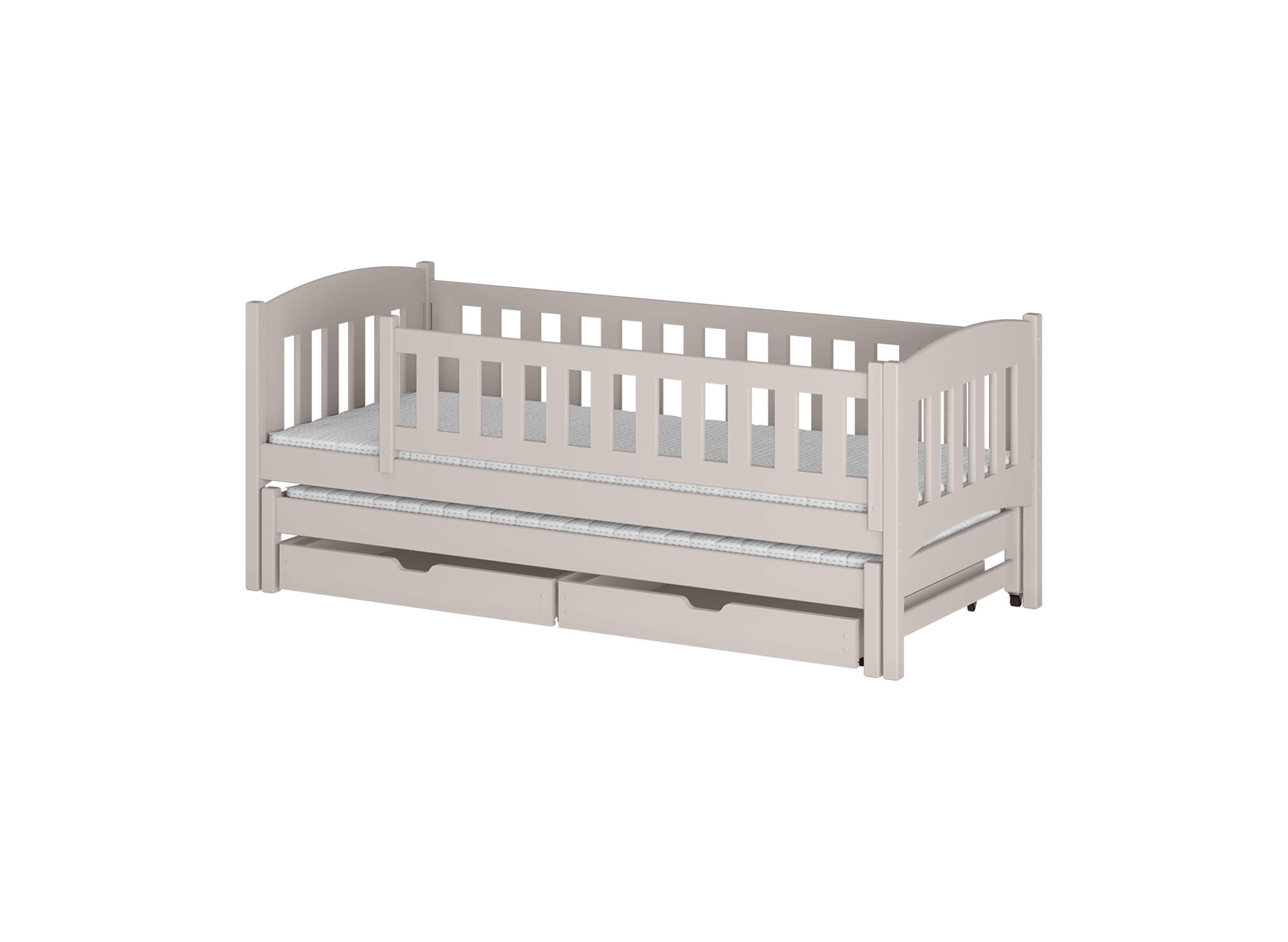V detskej izbe je síce šatník alebo samostatná šatňa, no ďalší úložný priestor určite nezanedbáte – obzvlášť v malej izbe. Detská posteľ AMALKA má dva výsuvné šuplíky . Čo v nich môžete ukryť? Veci, ktoré chcete mať po ruke – ako extra vankúše alebo teplú prikrývku na prikrytie vášho bábätka v chladnej noci. Dizajn postele AMALKA však zaujme nielen výsuvnou spodnou posteľou, na ktorej môže spať druhé dieťa. Konštrukcia bola tiež navrhnutá s ohľadom na maximálnu bezpečnosť detí. Hlavná posteľ je obohnaná vysokým zábradlím , vďaka ktorému sa vaše dieťa neprekotúľa na osobu spiacu pod ním. Obe úrovne spánku sú nastavené tak nízko, že pád na zem nebude bolestivý – ak sa rozhodnete odstrániť bočnice pre staršie dieťa.