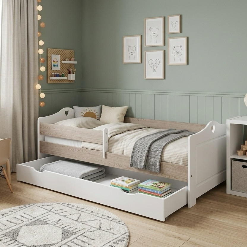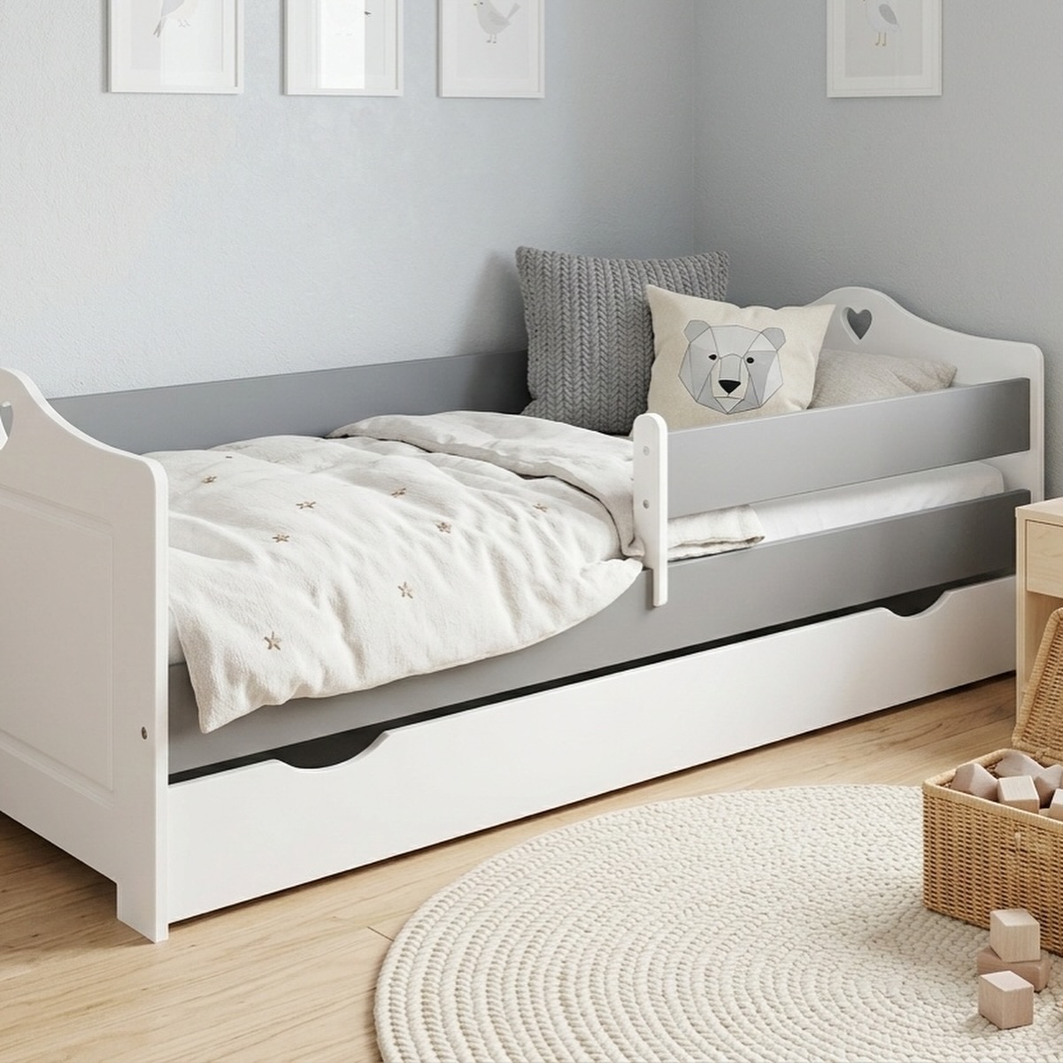 Táto pôvabná detská posteľ bola navrhnutá s ohľadom na pohodlie a bezpečnosť najmenších. Jej stabilná konštrukcia, nízka výška a praktická bezpečnostná zábrana pomáhajú vášmu drobčekovi pokojne spať a samostatne liezť do postele. Decentné detaily v tvare srdca dodávajú posteľ jedinečný a útulný charakter, ktorý krásne doplní výzdobu dievčenskej izby.