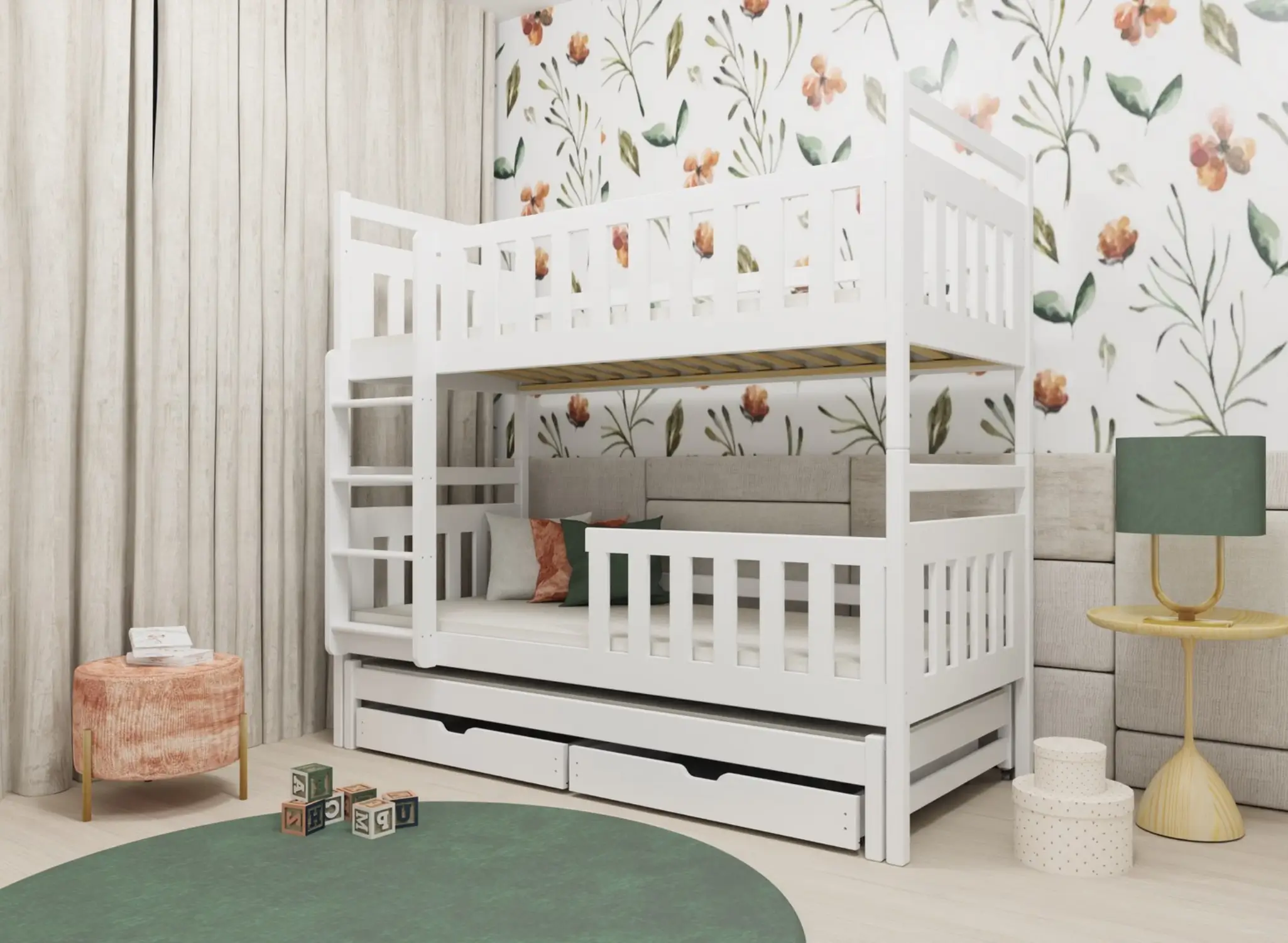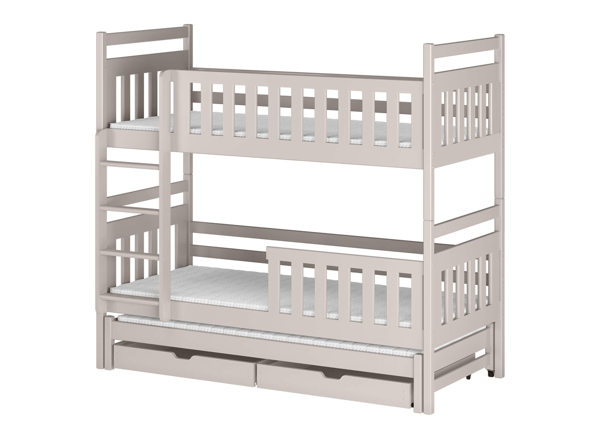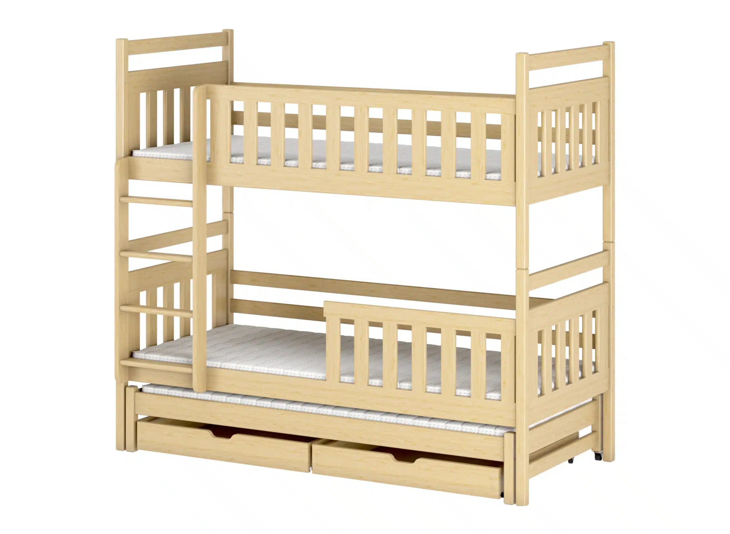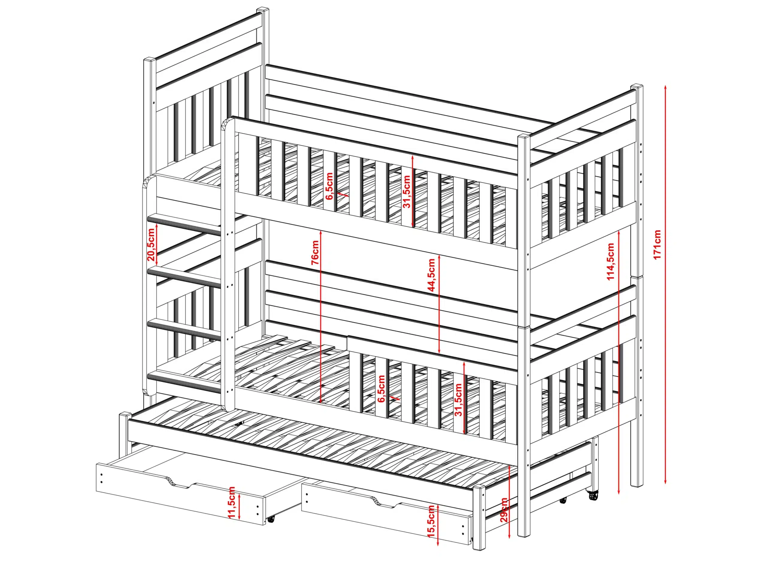 Poschodová posteľ LARY je vyrábaná s dôrazom na každý, aj ten najmenší detail. Materiály, ktoré používame, sa vyznačujú najvyššou kvalitou, pretože chceme zabezpečiť vášmu dieťaťu zdravý a pokojný spánok. Poschodová posteľ LARY je zaujímavou voľbou do detskej izby zariadenej v klasickom štýle. Klasický rám poschodovej postele LARY bude tvoriť zaujímavý akcent v kráľovstve vašich detí. Borovicové drevo zabezpečené antialergickou farbou zaistí trvácnosť poschodovej postele LARY na dlhé roky.LARY je trojposchodová posteľ, ktorá splní potreby aj tých najnáročnejších detí. Ochranné bariérky sú dostupné v dvoch verziách – pevne namontovanej alebo odnímateľnej. Tá druhá možnosť vám umožní odmontovať bariérku počas dňa, keď sa deti chcú hrať. Môžete ju nasadiť na noc, aby bolo vaše dieťa počas spánku v bezpečí. V poschodovej posteli LARY je tiež miesto na pohodlný matrac na vysúvacej plošine. To je zaujímavá voľba, ak máte deti v podobnom veku alebo ak často prijímate hostí.