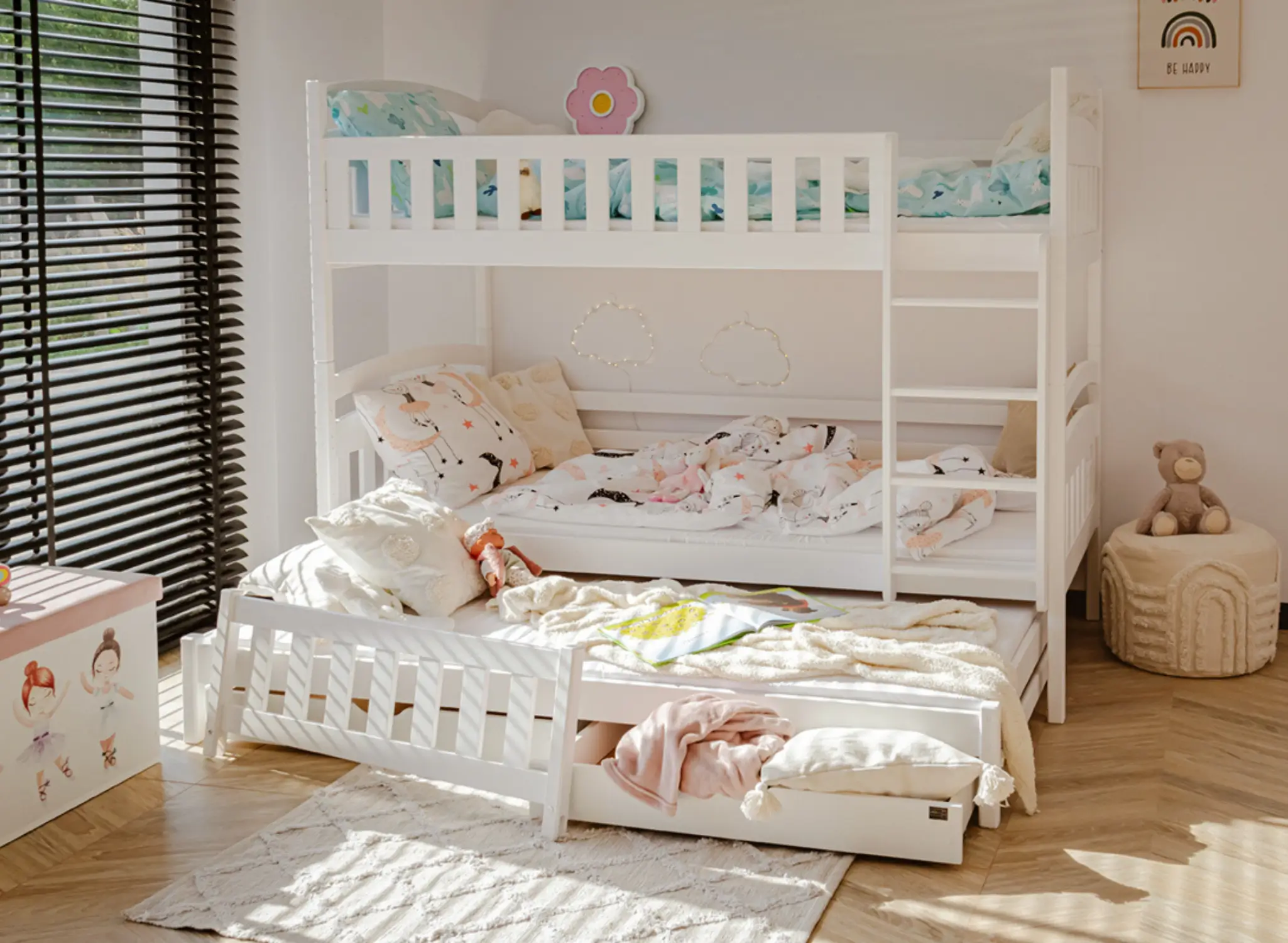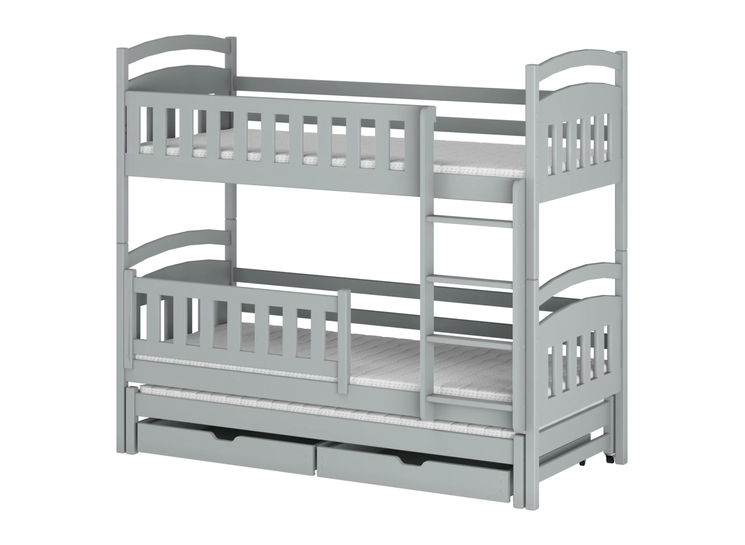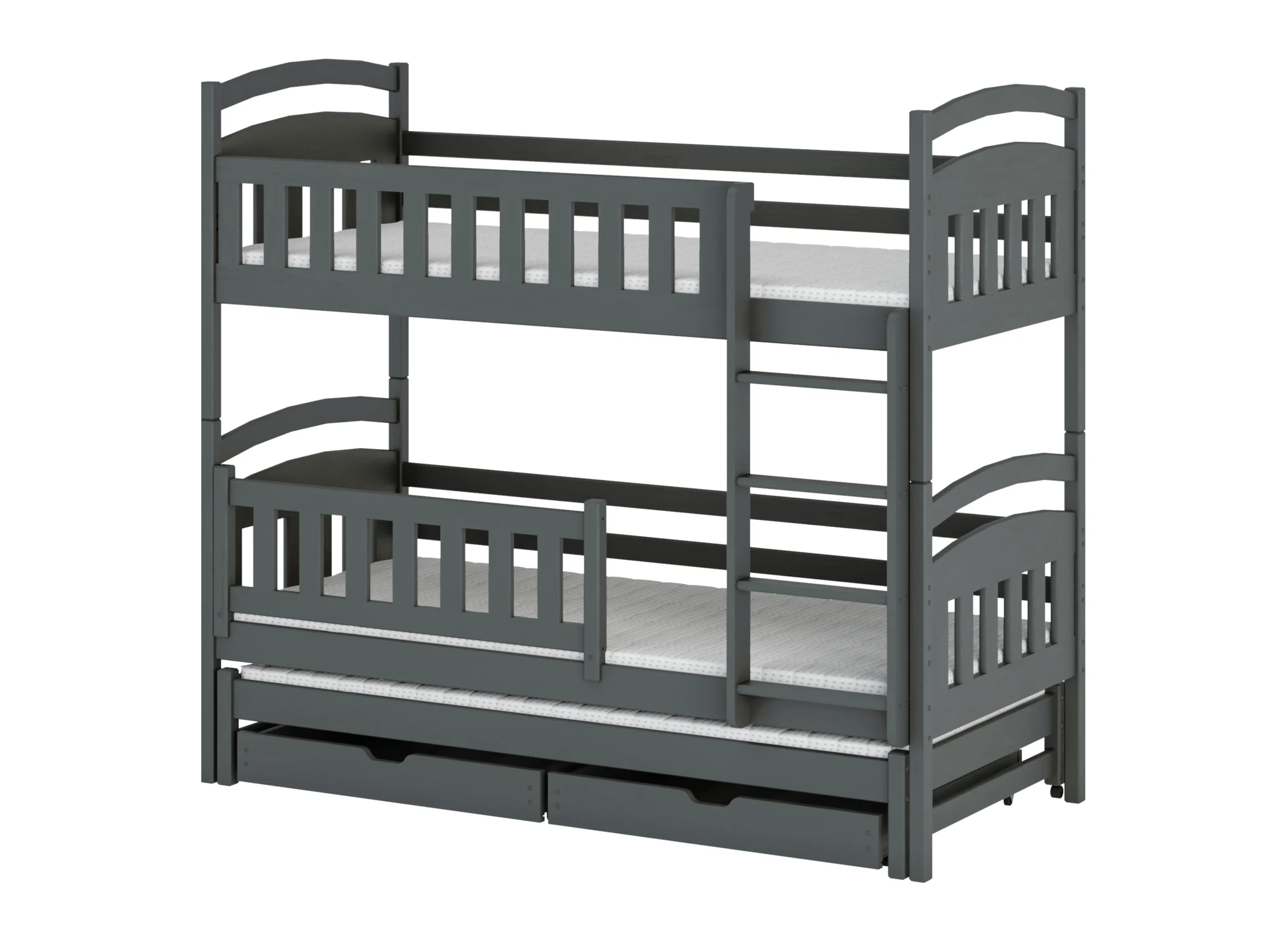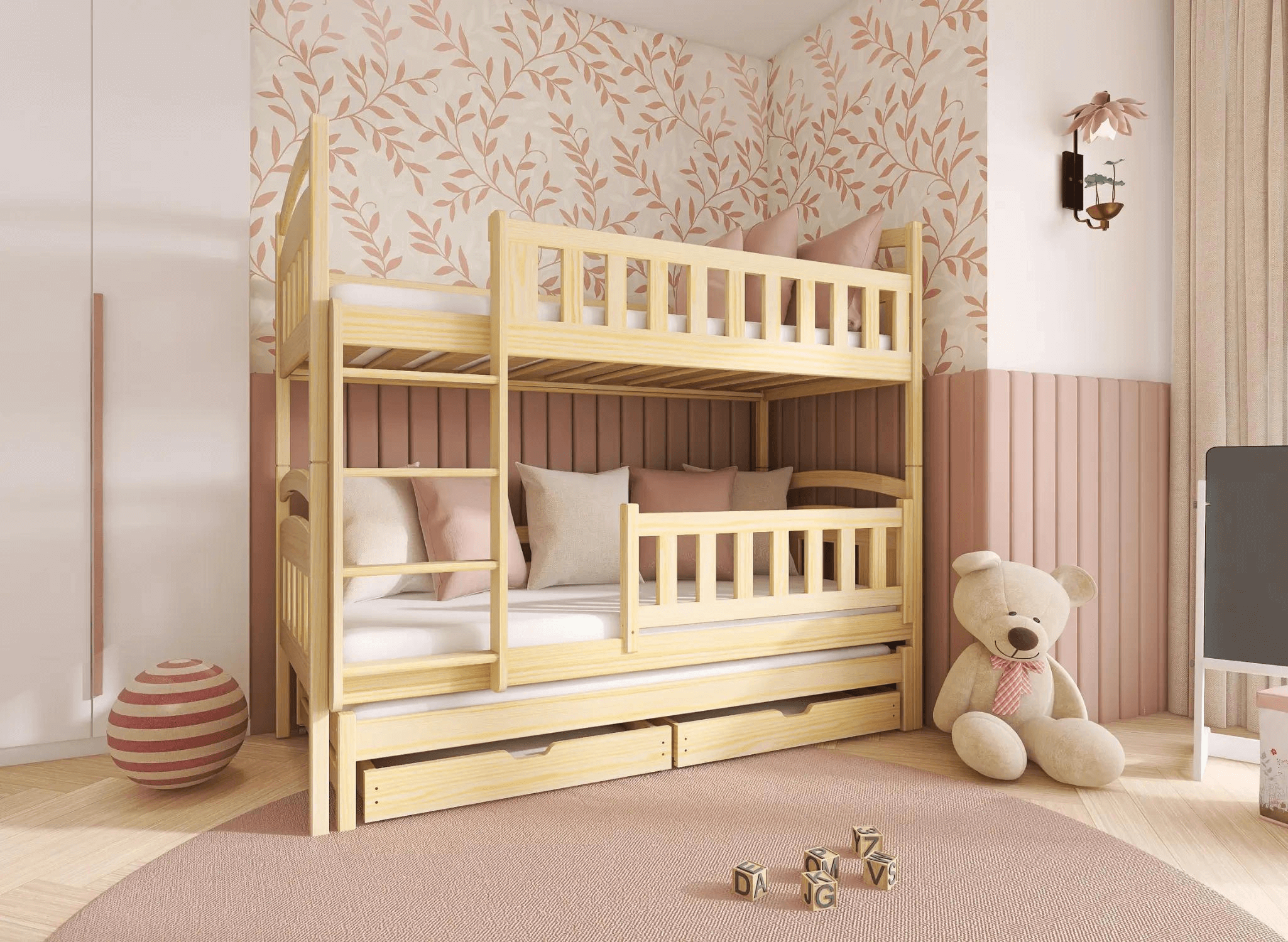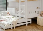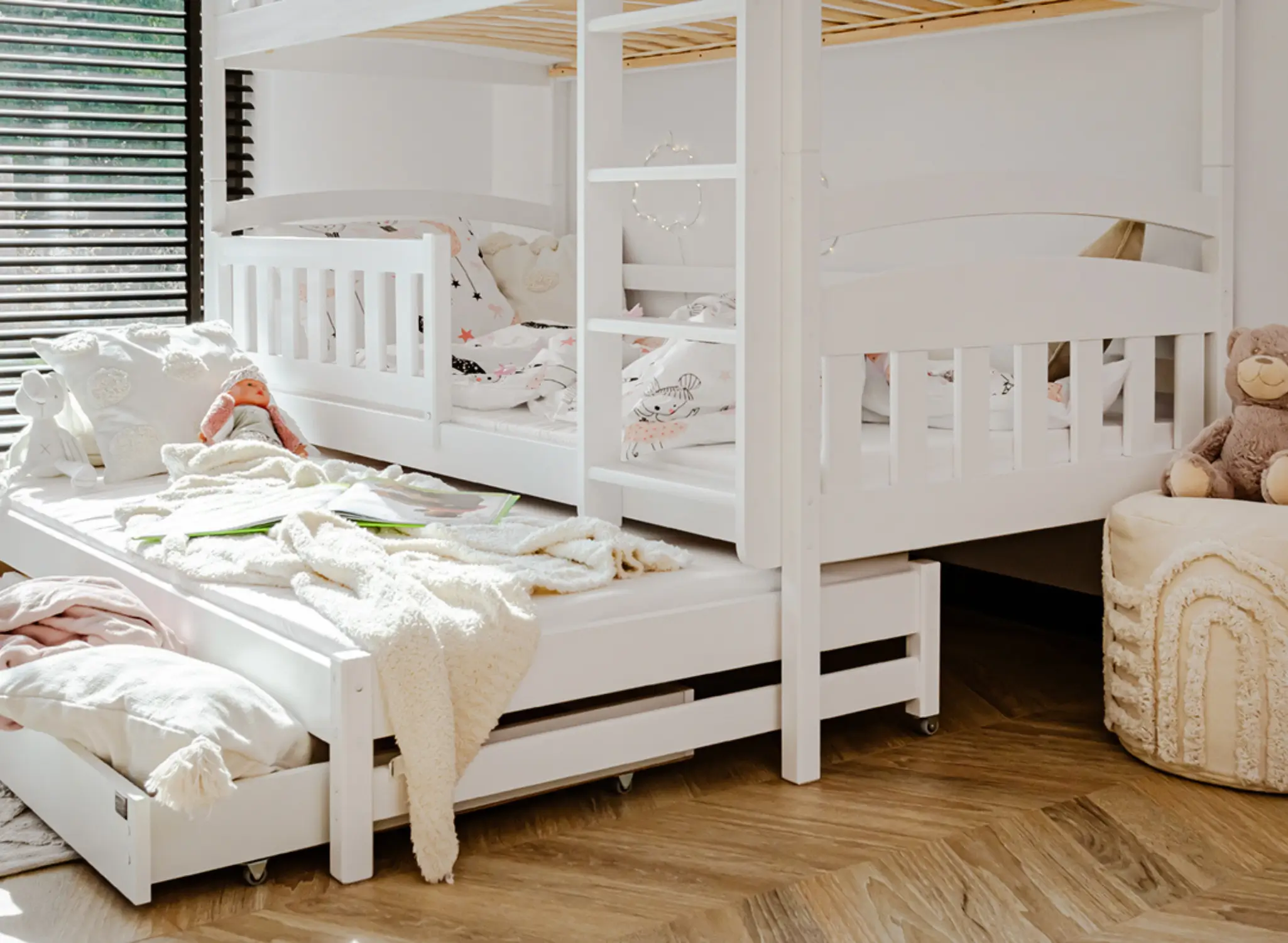 Na spodku trojposteľovej poschodovej postele LEA. môžu byť výsuvné zásuvky, ak sa rozhodneš pre takúto variantu. Ich priestranný vnútorný priestor pojme veľa vecí, ktoré zapratávajú priestor v detskej izbe, napríklad dlho nepoužívané hračky alebo prikrývky, po ktoré siahneš len v zime. Ďalší, výsuvný matrac na spodku sa stane neoceniteľnou pomocou, keď dieťa pozve na noc priateľov na veľké prenocovanie – zabezpečí hosťom komfort bez potreby použitia ďalších nafukovacích matracov.