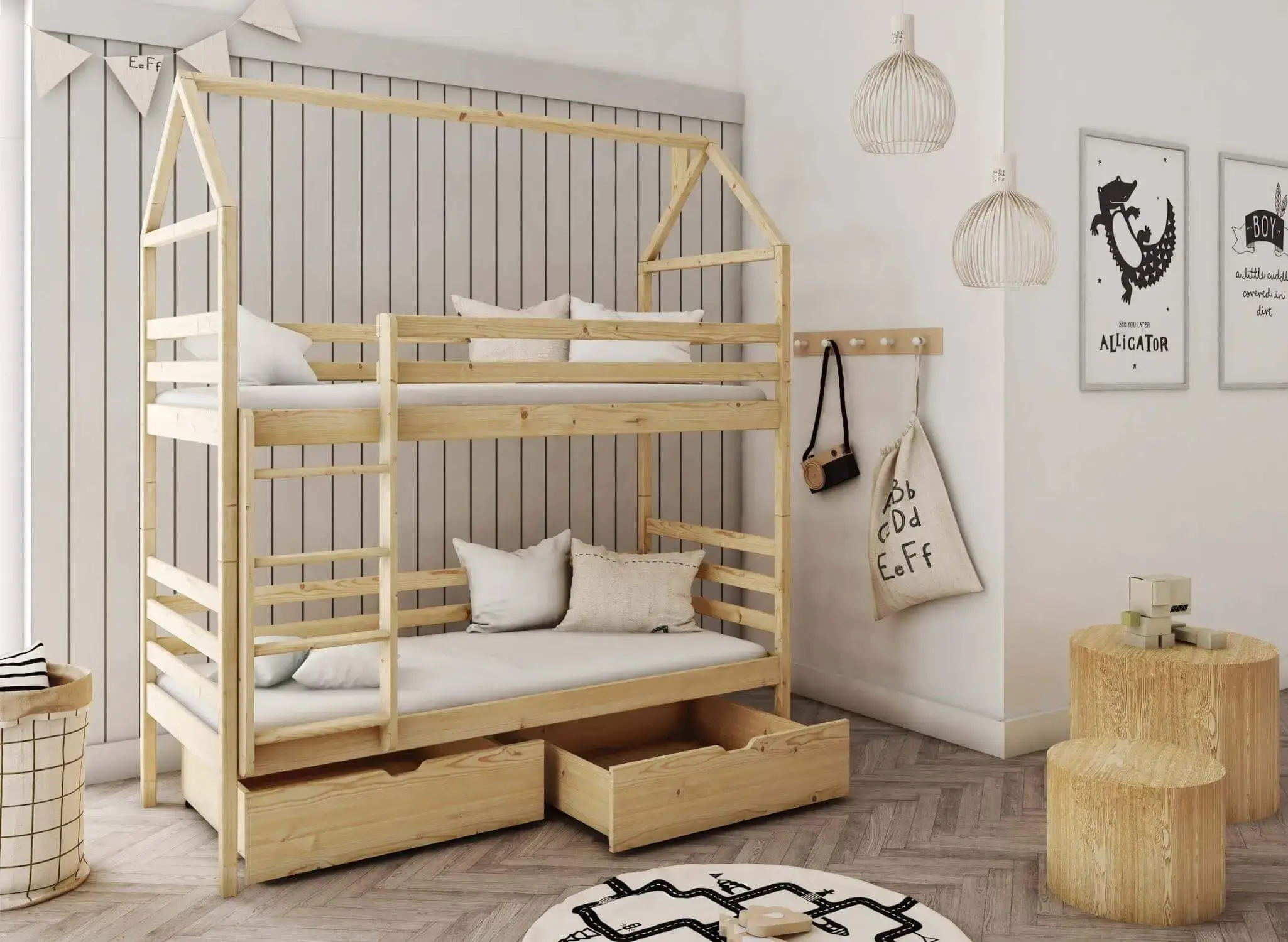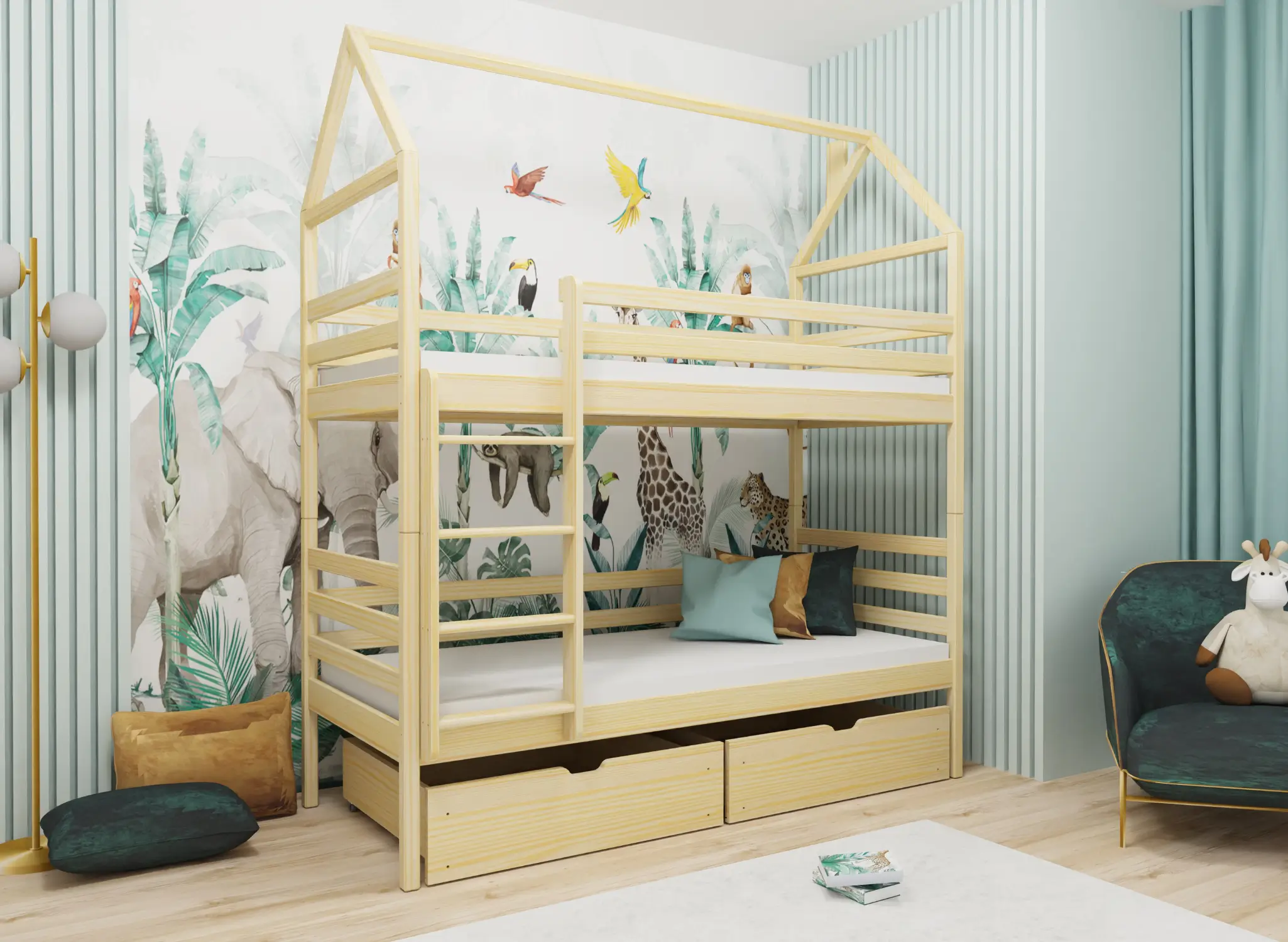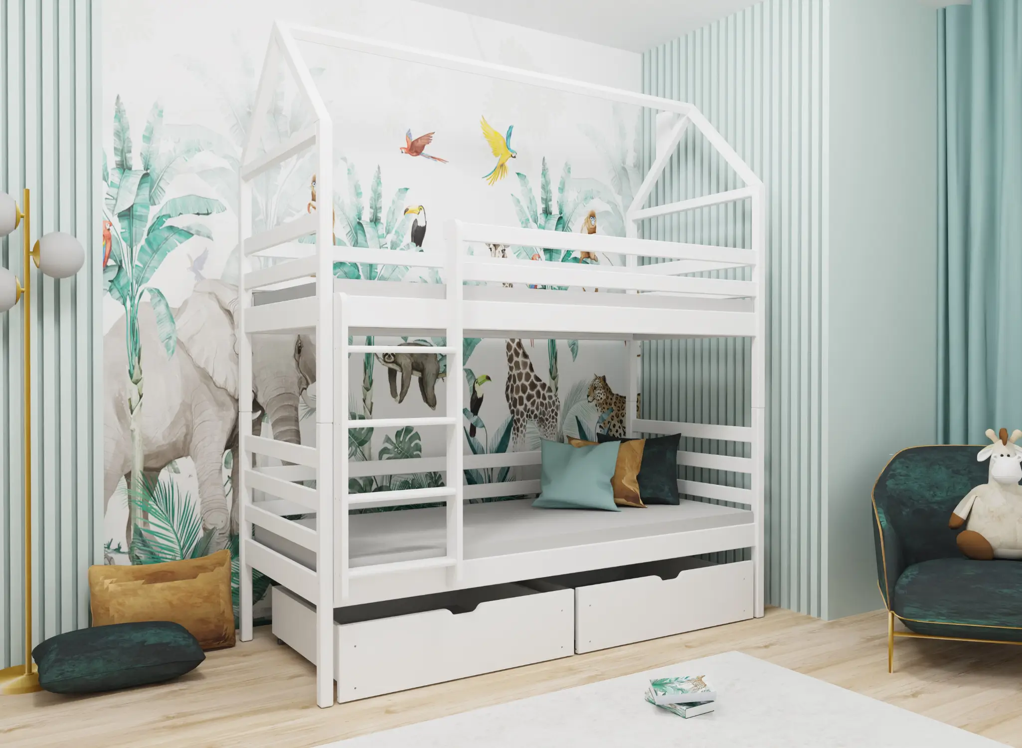 Detská posteľ domček LEXI je splnením snov každého malého dieťaťa. Je to starostlivo premyslená a dôkladne vyhotovená konštrukcia, ktorá podporuje kreativitu a pôsobí na zmysly. Vysoká odolnosť a stabilita robí z neho detský nábytok, ktorý bude bezproblémovo používaný mnoho rokov. Zaručujeme tiež, že každé dieťa bude nadšené z jeho vlastníctva každý deň. Kladieme najväčší dôraz nielen na vizuálnu stránku, ale najmä na funkčnosť detských postelí. Preto poschodová posteľ domček LEXI zaisťuje nielen pohodlný spánok, ale aj bezpečné uloženie rôznych drobností. Pod detskou posteľou LEXI sa nachádzajú praktické zásuvky, ktoré umožňujú uloženie posteľnej bielizne, oblečenia a množstva hračiek. Už nebudete mať problém s roztrúsenými predmetmi po izbe. Teraz pre ne vždy bude miesto.