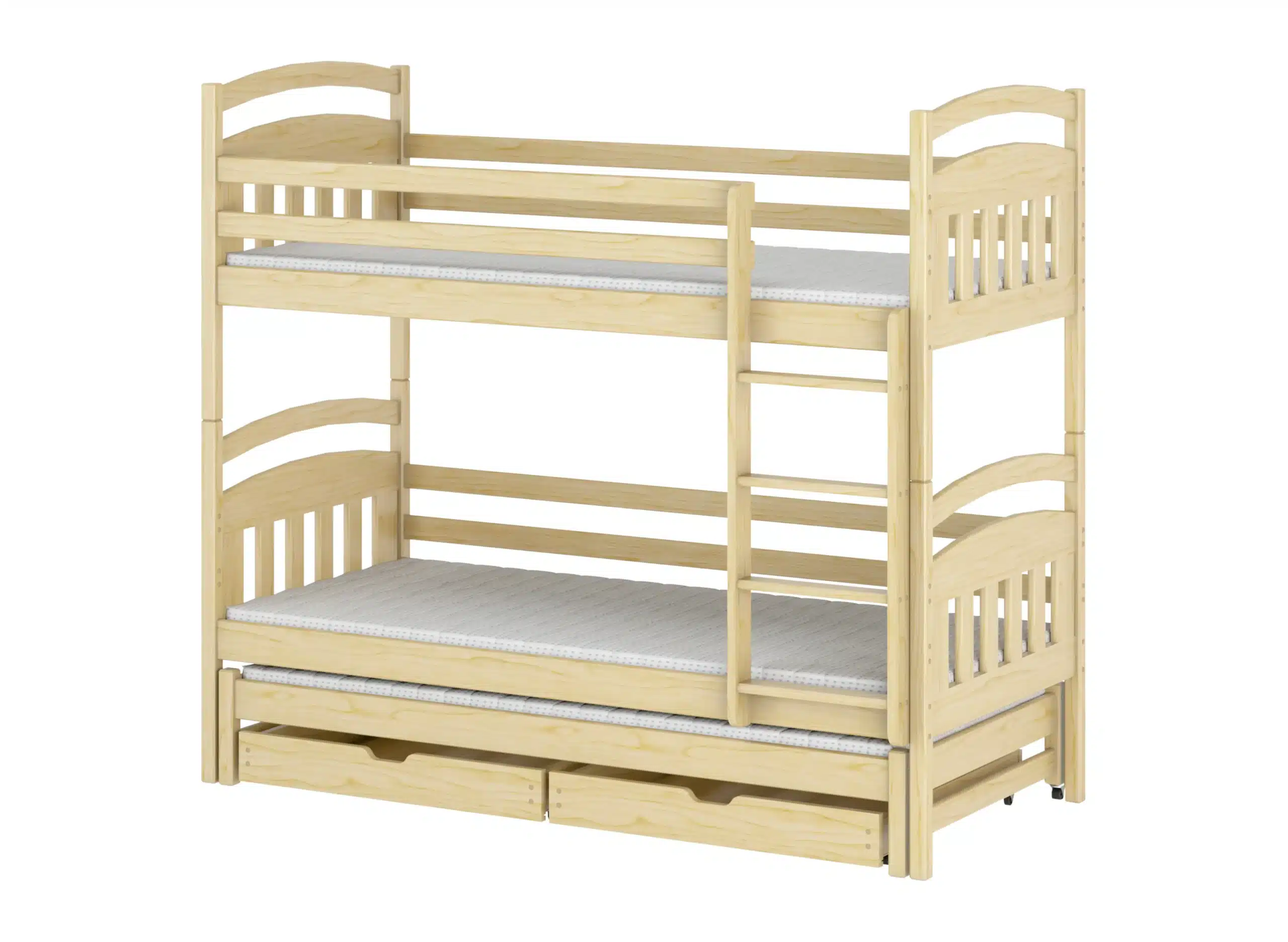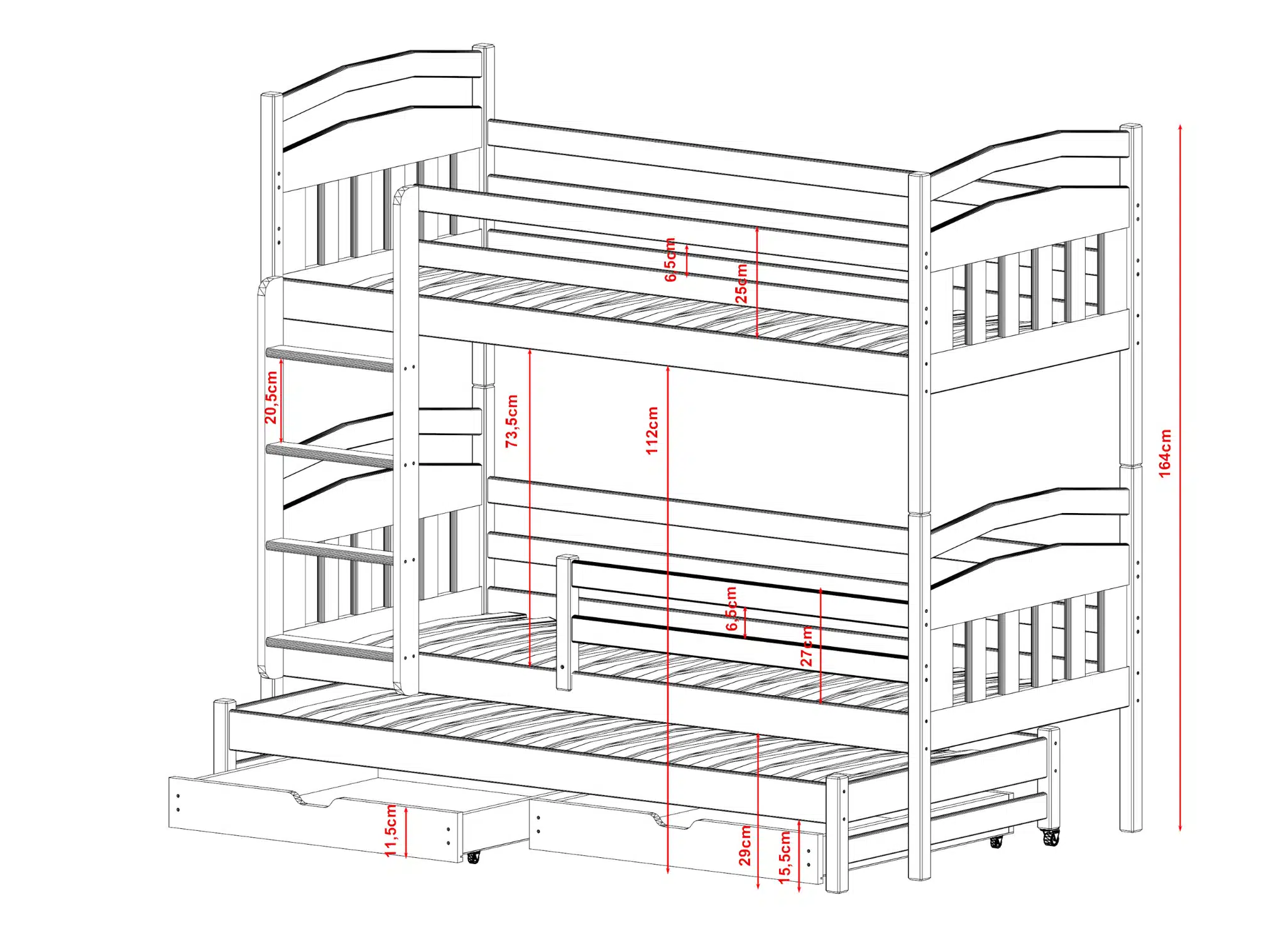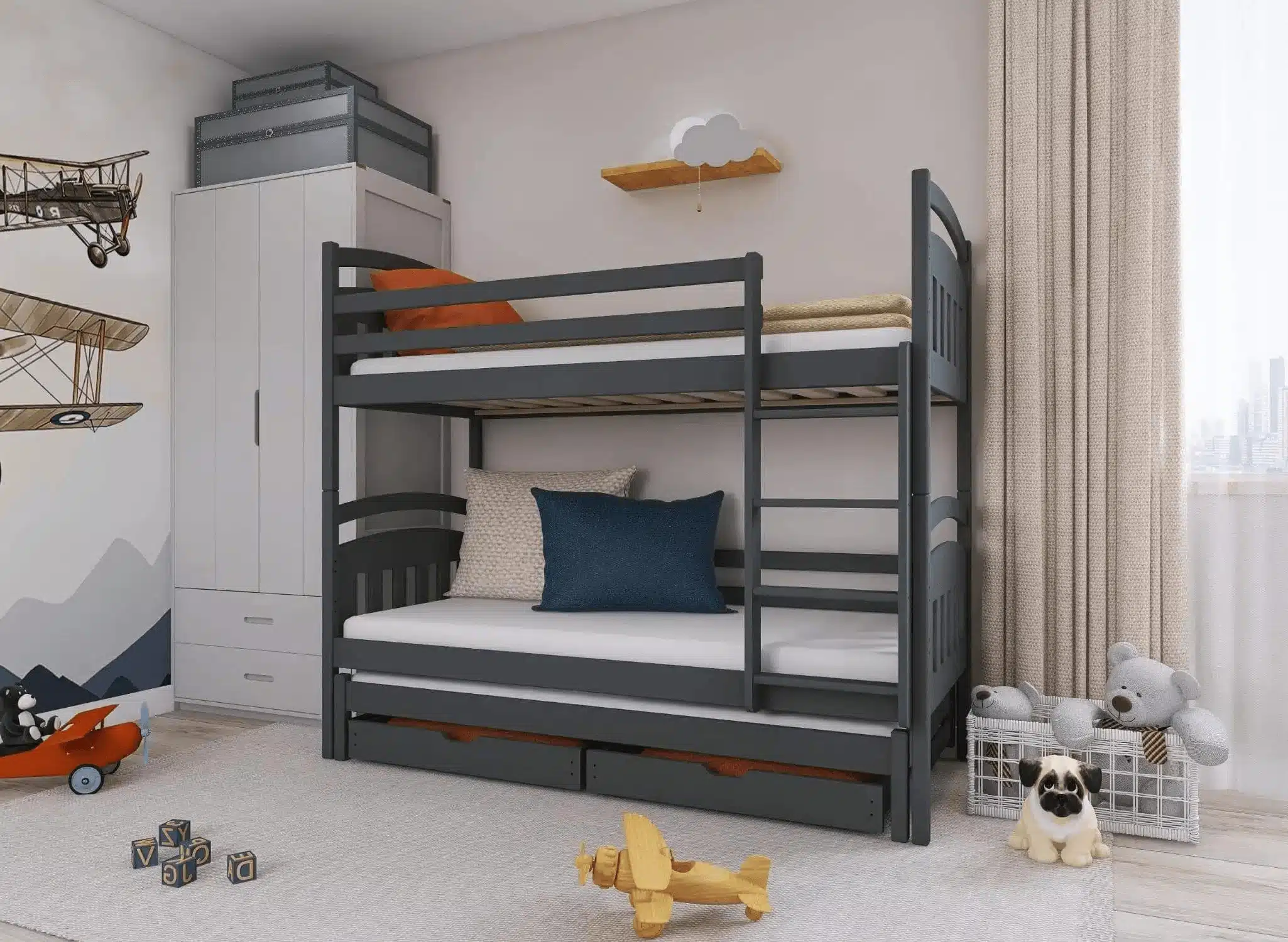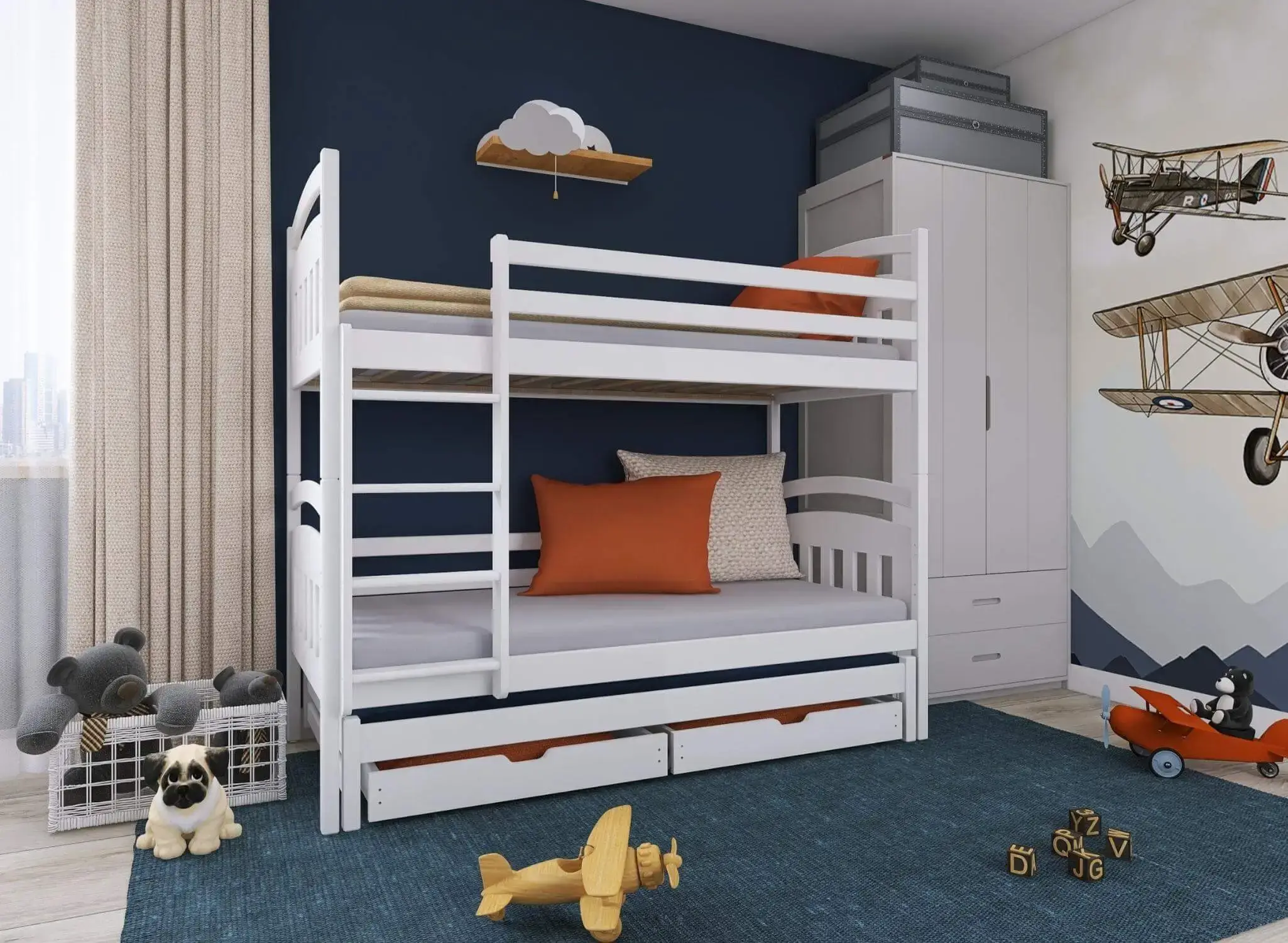 Trojlôžková poschodová posteľ NELA sa perfektne osvedčí, ak chceš vytvoriť pohodlné podmienky na spanie pre tri deti. Tri miesta na spanie s takmer rovnakými rozmermi zabezpečia každému dieťaťu optimálny komfort počas noci, bez ohľadu na to, na ktorej úrovni spí. Tretí matrac môže byť aj dodatočnou možnosťou pre hostí alebo miestom, kde sa budú deti hrať, aby nezanechávali hračky v posteli.