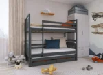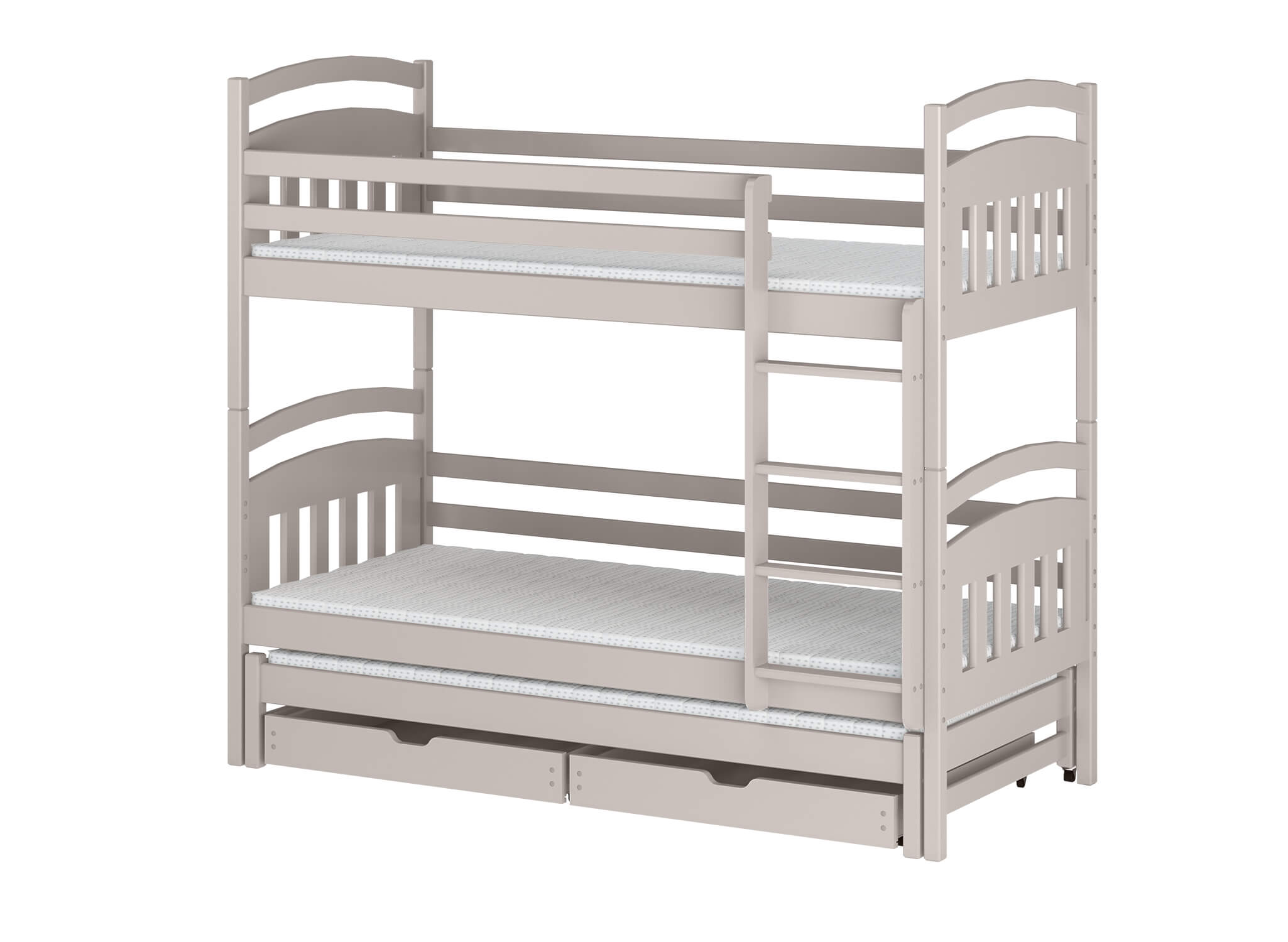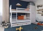 Personalizovaním poschodovej postele NELA poskytujeme možnosť umiestnenia výsuvných zásuviek v spodnej časti nábytku, ktoré pojmú mnoho pokladov a pomôžu usporiadať neporiadok v detskej izbe. Ak bude na spodnej posteli spať staršie dieťa, stojí za to zvážiť zvýšenie svetlej výšky medzi úrovňami o ďalších 22 cm, aby sa zabezpečil väčší komfort.