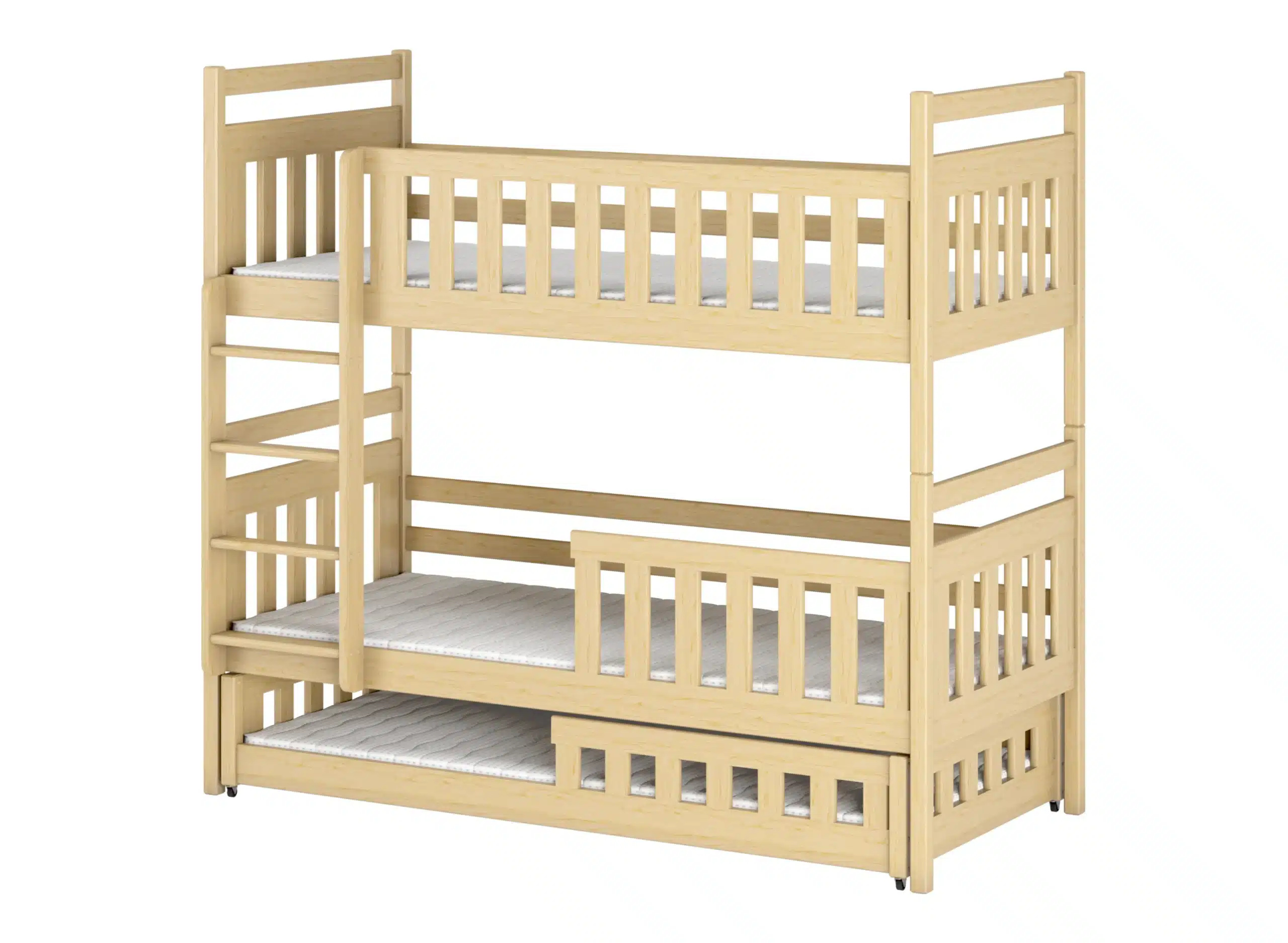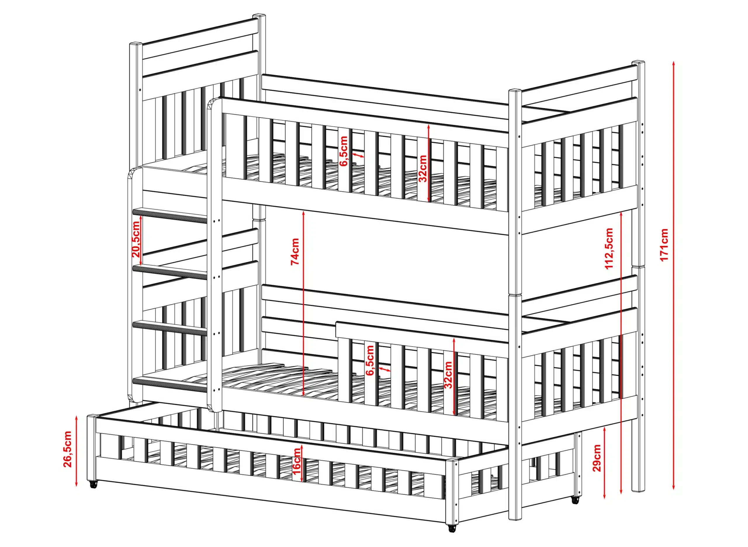 Máš trojicu detí, ktoré zdieľajú jedenu detskú izbu? Hľadáš riešenia, ktoré budú praktické? Ak áno, máme pre Teba to, čo hľadáš. Naša poschodová posteľ OLI spája v sebe dve riešenia, vďaka čomu pojme trojicu detí. Posteľ pre súrodencov OLI je poschodová posteľ, ktorá má v spodnej časti skryté vysúvacie, nezávislé tretie lôžko. Rozhodnutím pre našu poschodovú posteľ OLI rozhoduješ o spôsobe montáže bezpečnostných zábran, ako aj o tak dôležitom parametri, akým je druh matraca. Vďaka tejto personalizácii ľahko prispôsobíš poschodovú posteľ OLI nielen veku, ale aj požiadavkám a fyzickým vlastnostiam Tvojich detí.