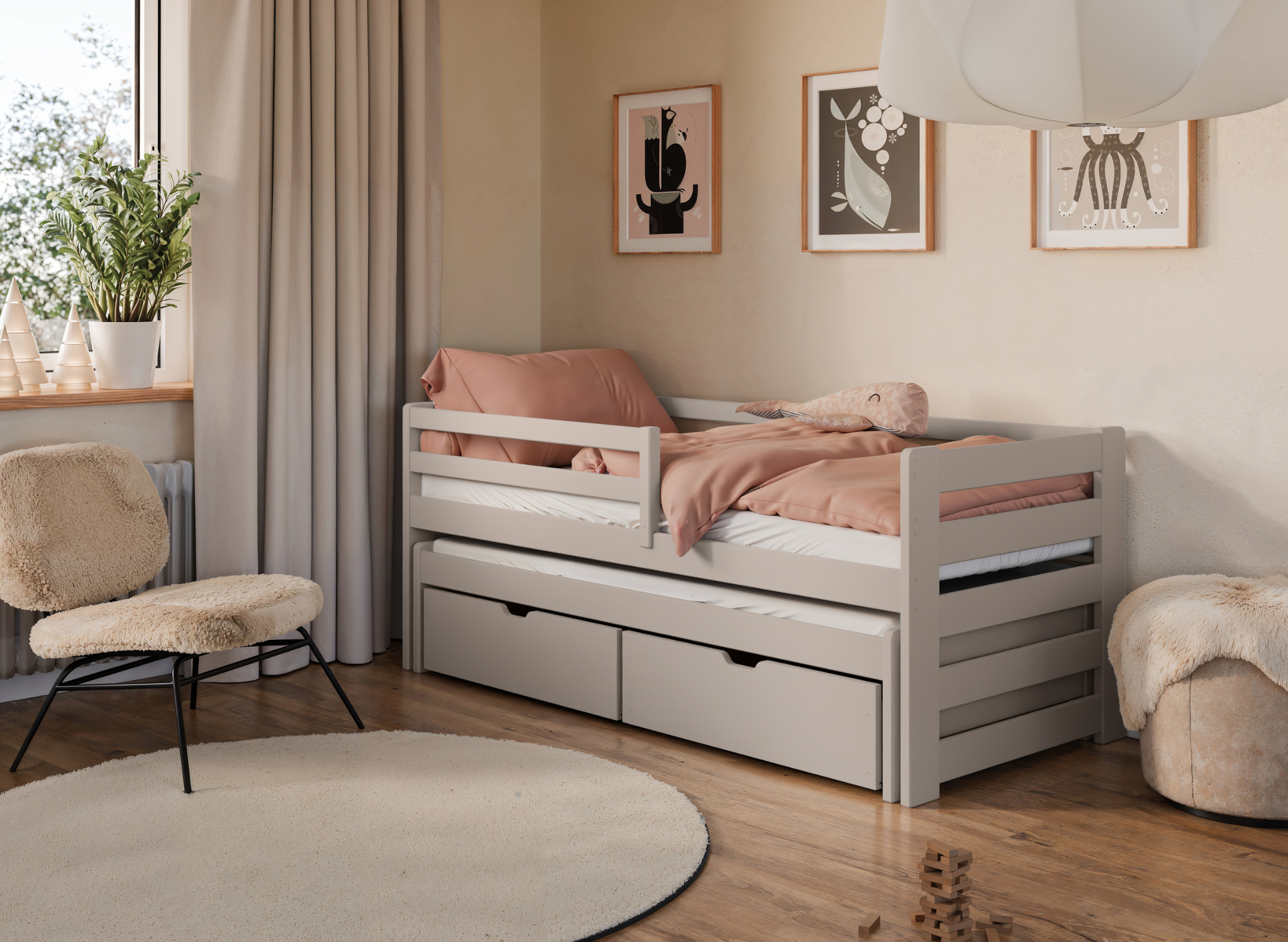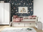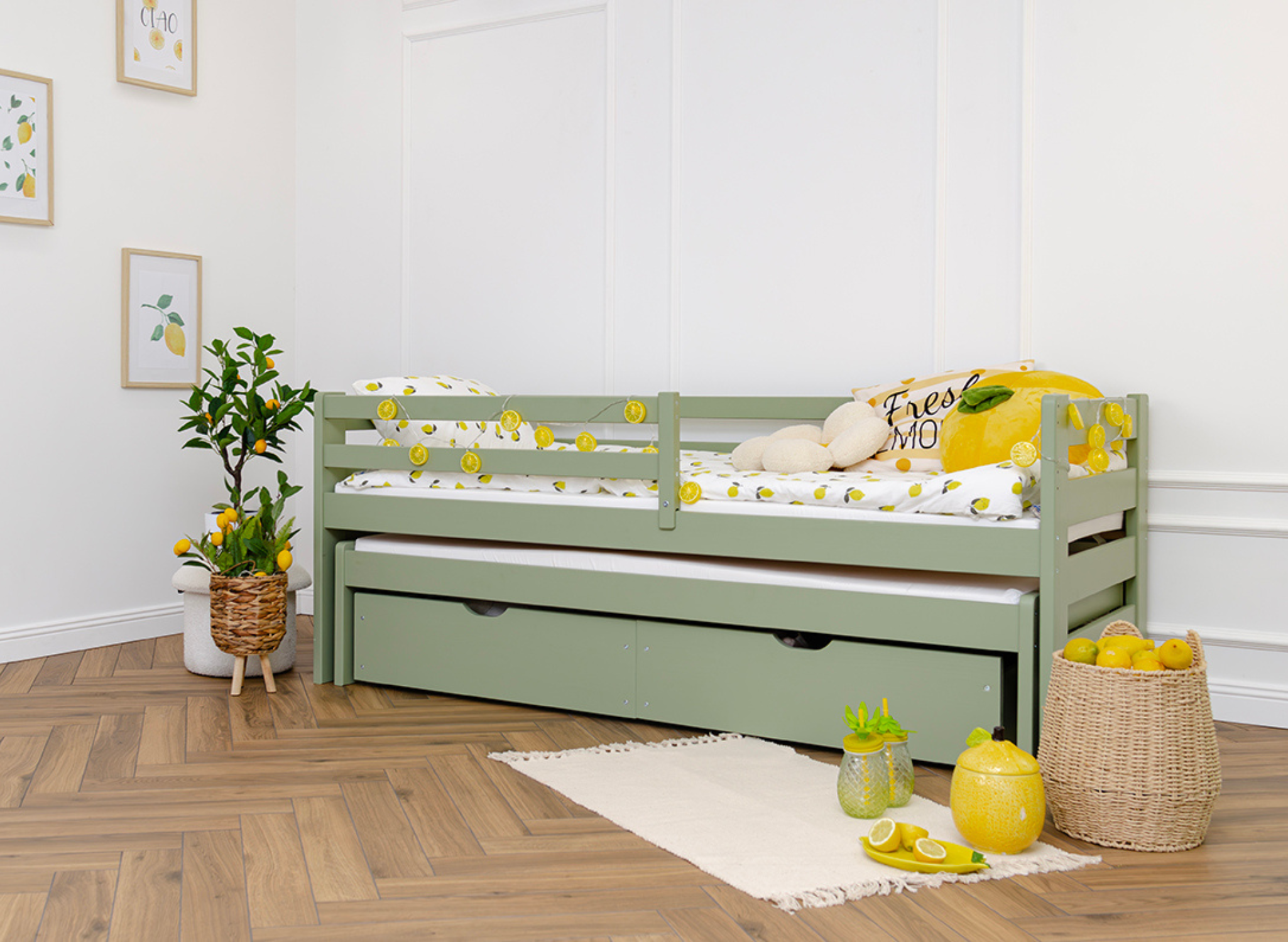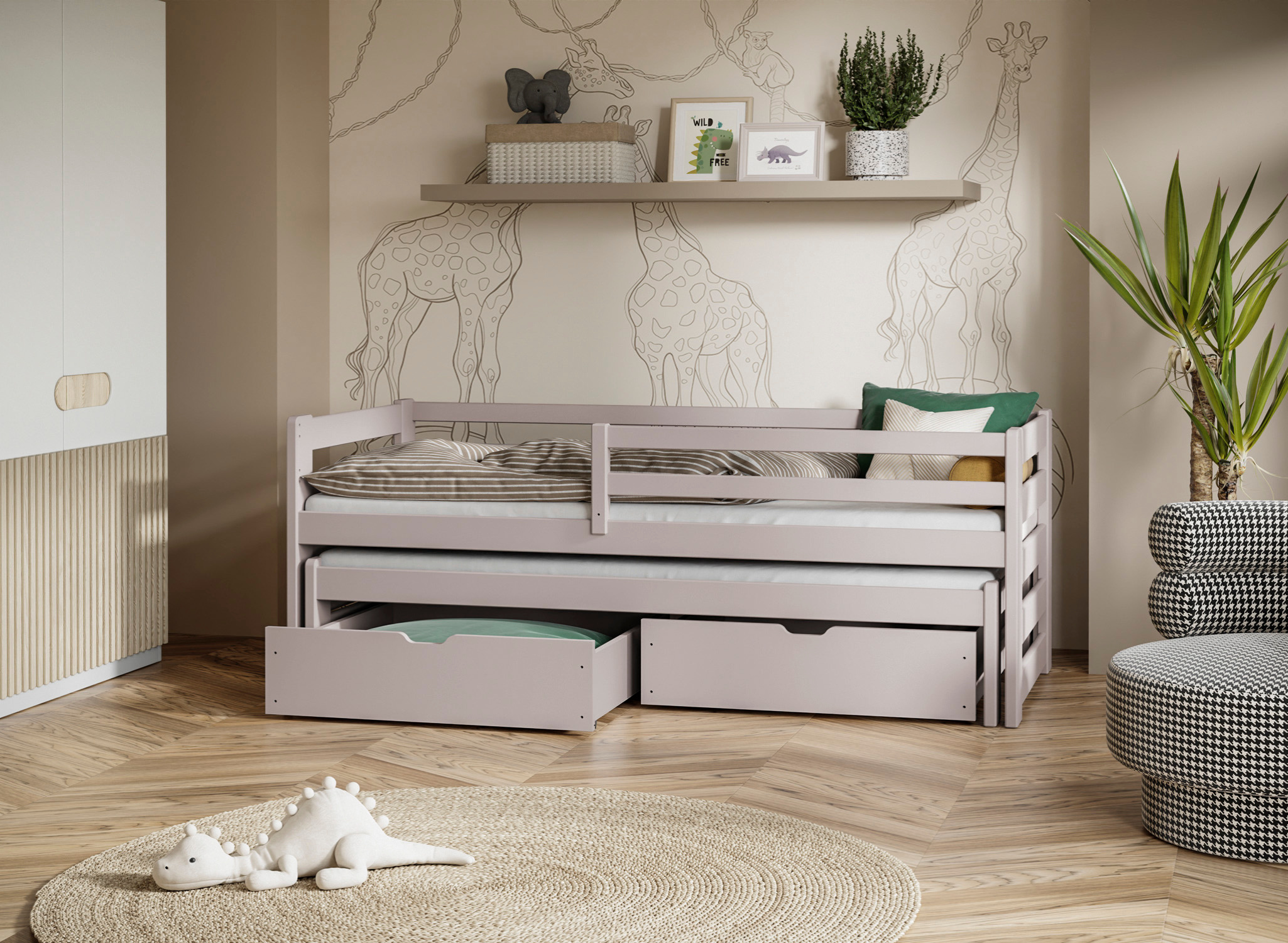 SENZO je drevená vysúvacia posteľ určená do súrodeneckej izby . Zaberá málo miesta, vďaka čomu je ideálny do malých miestností . Vyznačuje sa jednoduchou štruktúrou a dizajnom, vďaka čomu je vizuálne univerzálny – hodí sa do každého štýlu interiéru. Posteľ SENZO má výsuvnú platformu, vďaka čomu je ideálnym miestom na trávenie voľného času počas dňa . V noci ho môžete premeniť na nočnú zónu s dvomi matracmi v nižšej a vyššej výške. Je venovaný izbe, ktorú zdieľajú dvaja súrodenci . Vďaka bezpečnostnej zábrane ich využijete aj s menšími deťmi.