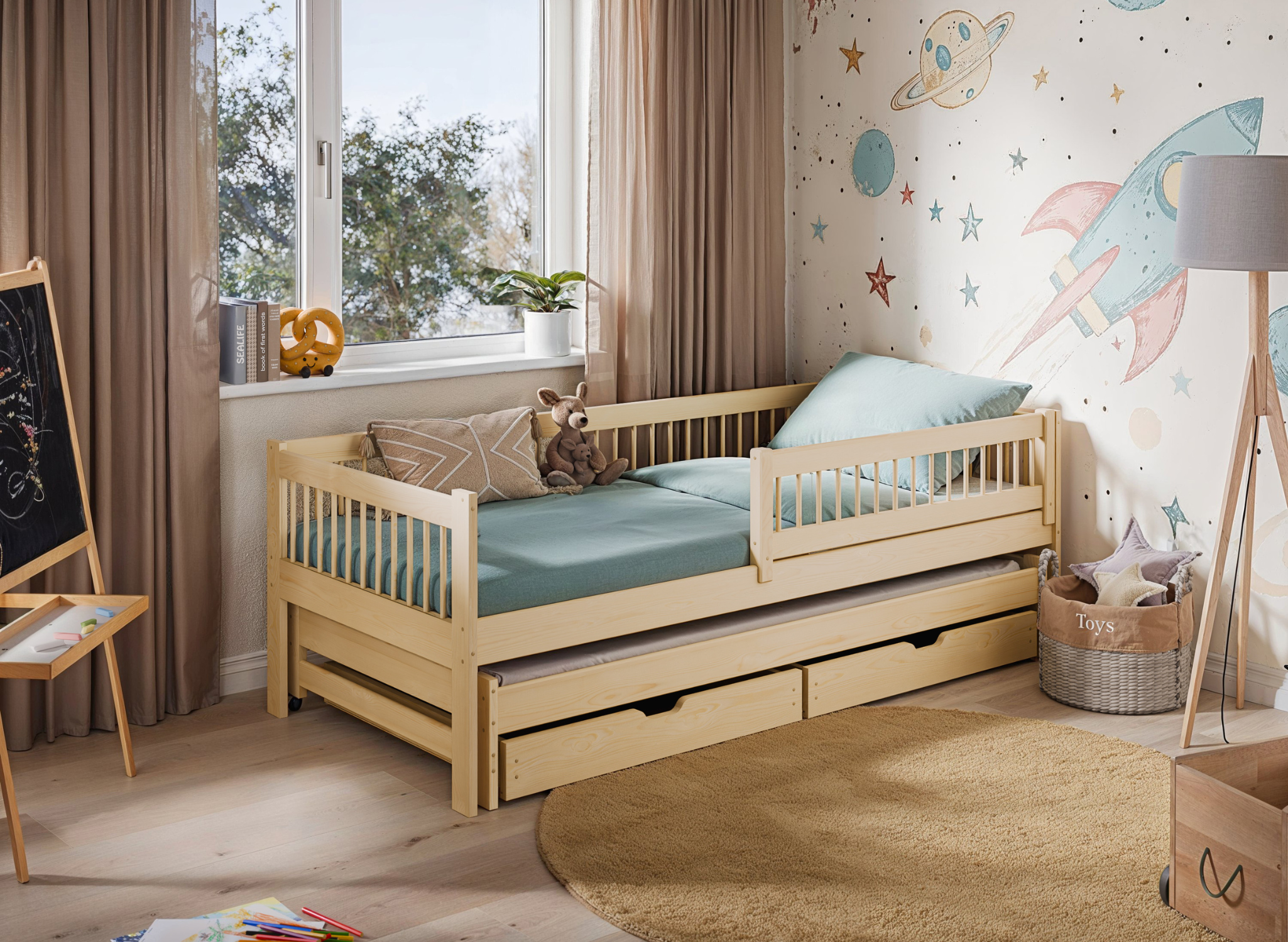 Detská posteľ SOFTI je nábytok, ktorý každý deň vyvolá úsmev na tvári tvojho dieťaťa. Stabilná konštrukcia zaručuje trvanlivosť na roky. Tajomstvom konštrukcie je jednoduchá forma, ktorá je vyrobená z borovicového dreva. Okrem toho určite oceníš univerzálny dizajn detskej postele SOFTI. Hodí sa do každej aranžácie detskej izby a každého štýlu. Nemusíš sa obávať, že po rekonštrukcii nebude ladiť so zvyškom vybavenia. Nečakaj a využij túto skvelú ponuku už teraz. Dbáme na to, aby naše produkty nielen ohromovali vzhľadom, komfortom a funkčnosťou, ale aj bezpečnosťou. Preto je detská posteľ SOFTI vyrobená z vysokokvalitného borovicového dreva, pokrytého zdravotne nezávadným lakom. Drevo je antistatické a nepriťahuje prach. Okraje postele a všetky kritické časti sú zaoblené, čo eliminuje riziko oderov. Čerešničkou na torte sú ochranné zábrany, ktoré chránia dieťa pred vypadnutím alebo vyjdením z postele počas spánku.