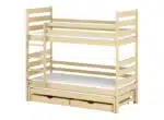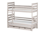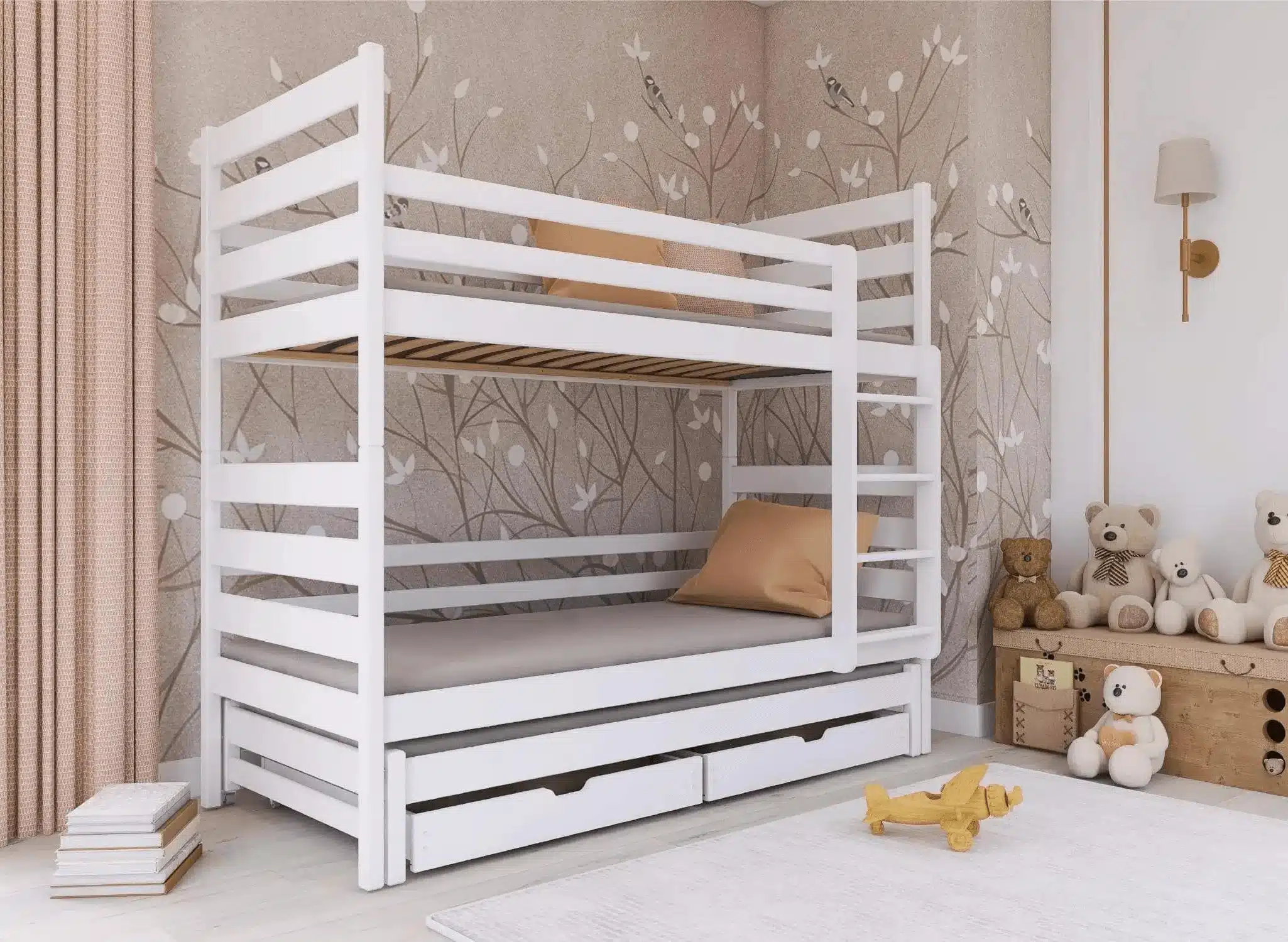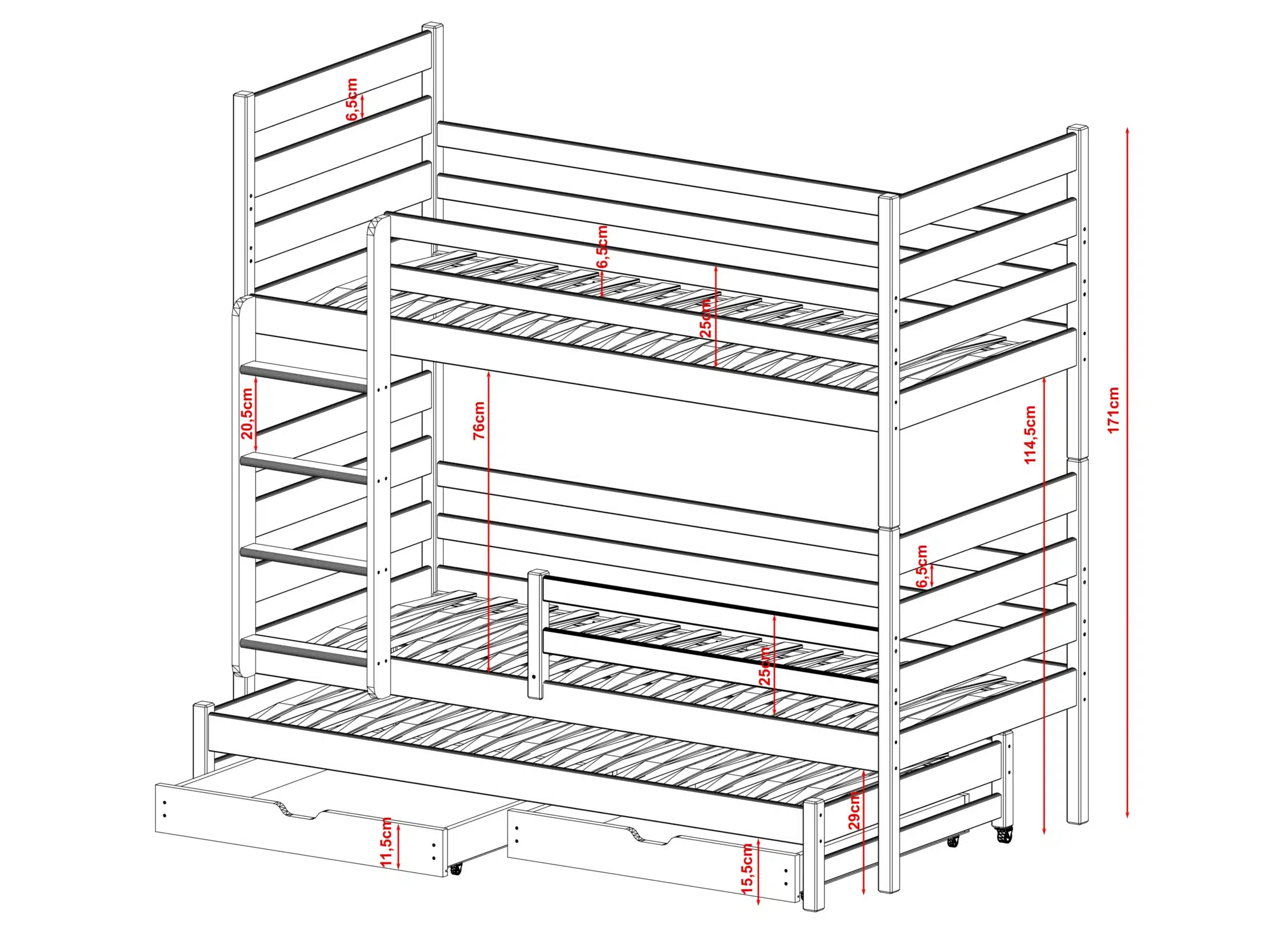 Drevené zábrany a pohodlné rebríky sa vyznačujú univerzálnosťou, takže aj keď sa po čase rozhodnete zmeniť aranžmán, môžete si ľahko vybrať, na ktorej strane bude vchod. Montáž poschodovej postele TIMO  prebieha pomocou imbusových skrutiek, čo znamená, že ju môžete kedykoľvek rozložiť a premiestniť na iné miesto. Zaujímavým riešením sú aj priestranné zásuvky, nachádzajúce sa pod spodným matracom. Môžete do nich uložiť posteľnú bielizeň alebo hračky, aby v detskej izbe vždy vládol poriadok.