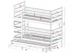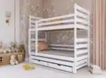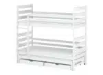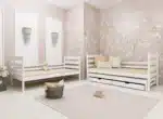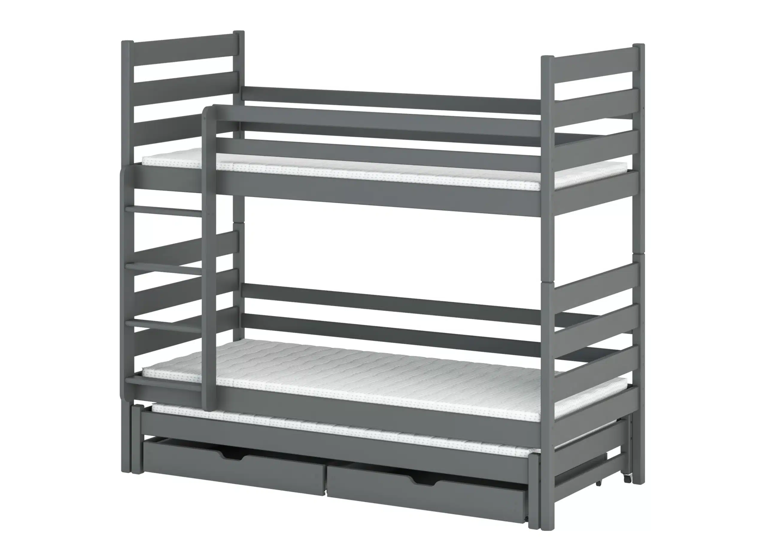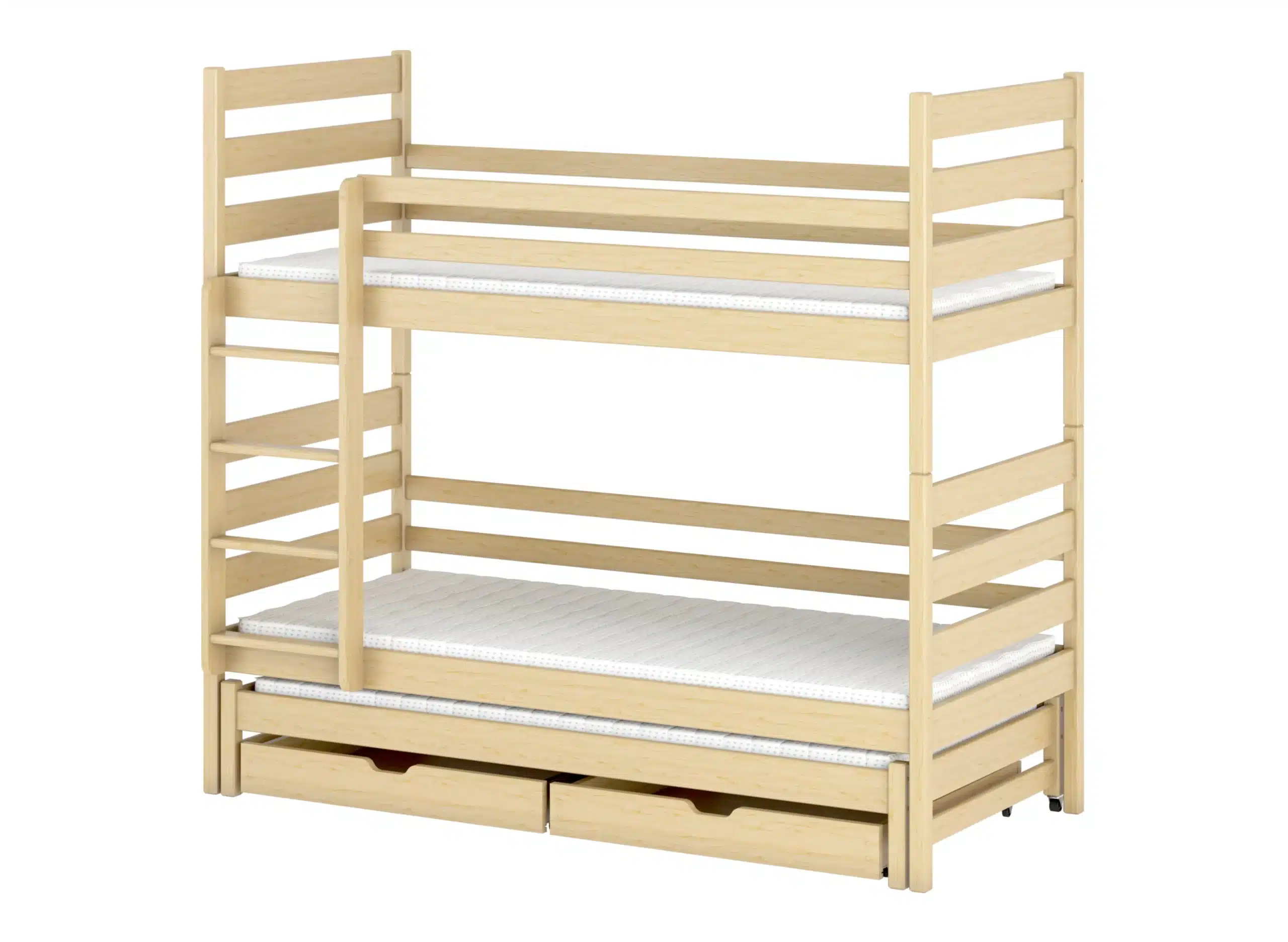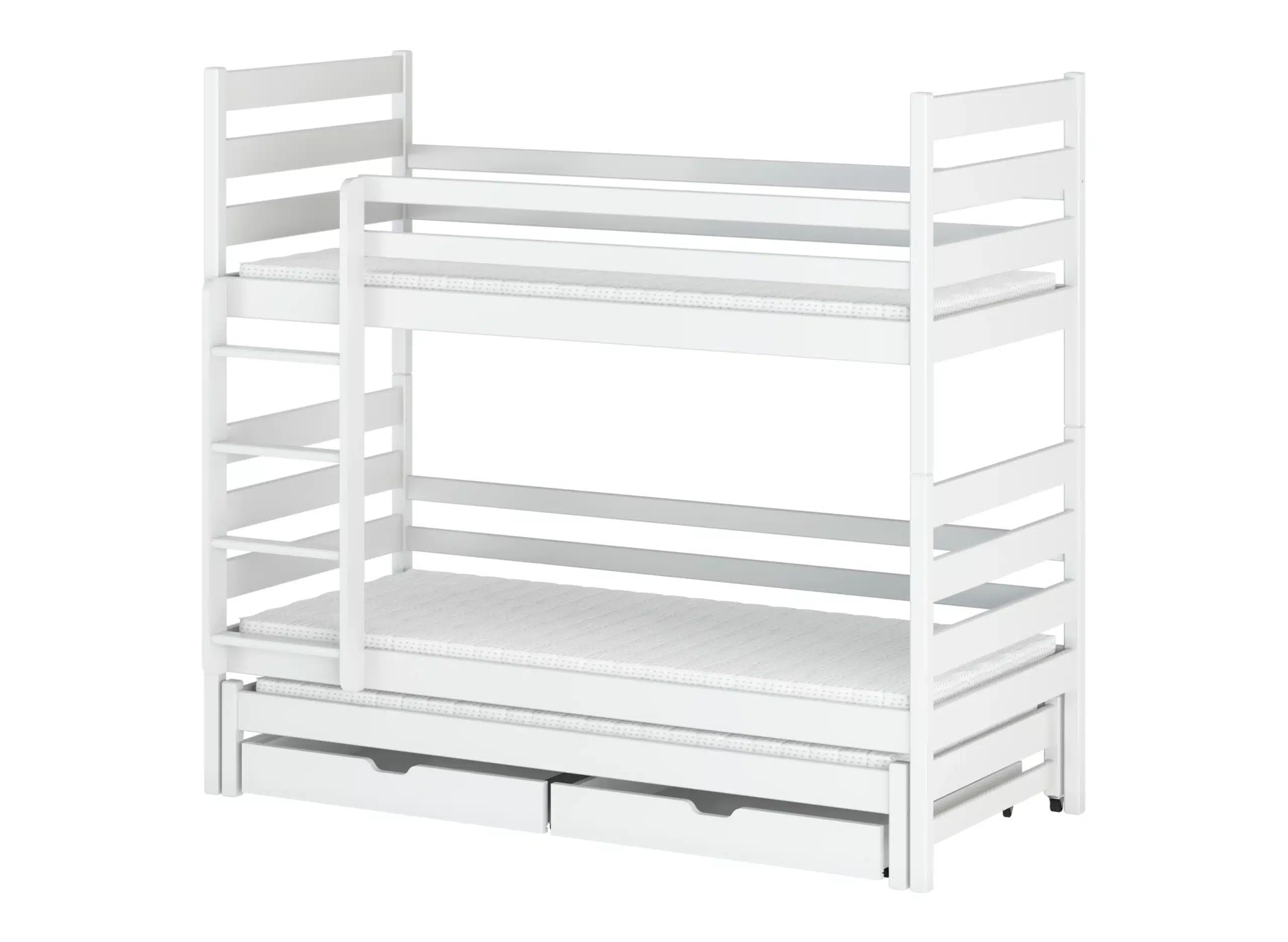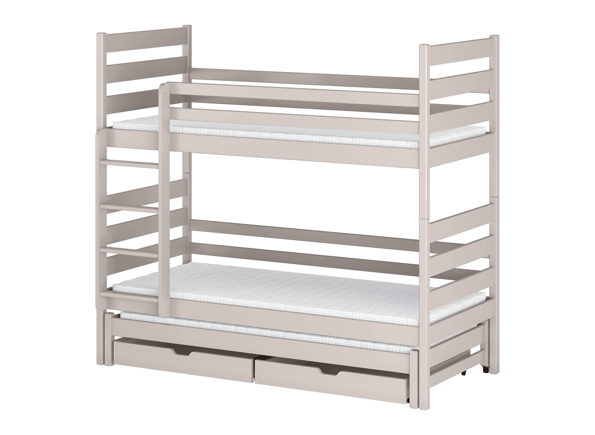 V Raj posteli dbáme o bezpečnosť vášho dieťaťa, preto sú všetky naše postele pre deti vyrábané v súlade s najvyššími štandardmi. Rám poschodovej postele TIMO  je vyrobený z borovicového dreva a natretý vodou riediteľnou farbou, ktorá je trvácna a spĺňa všetky normy týkajúce sa ochrany zdravia. Okrem toho univerzálny vzhľad nábytku umožňuje ľahké prispôsobenie interiérovému dizajnu a premení izbu vášho dieťaťa na útulnú detskú spálňu. Poschodová posteľ TIMO  môže byť zaujímavou voľbou ako pre dvojčatá, tak aj pre súrodencov v podobnom veku. Poschodovú posteľ TIMO  môžete prispôsobiť svojim individuálnym požiadavkám. V posteli sú k dispozícii až 3 miesta na spanie, takže si môžete vybrať horný a spodný matrac a matrac na vysúvaciu podložku. Ak vaše deti nebudú chcieť používať poschodovú posteľ TIMO , môžete ju kedykoľvek rozložiť na dva samostatné rámy.