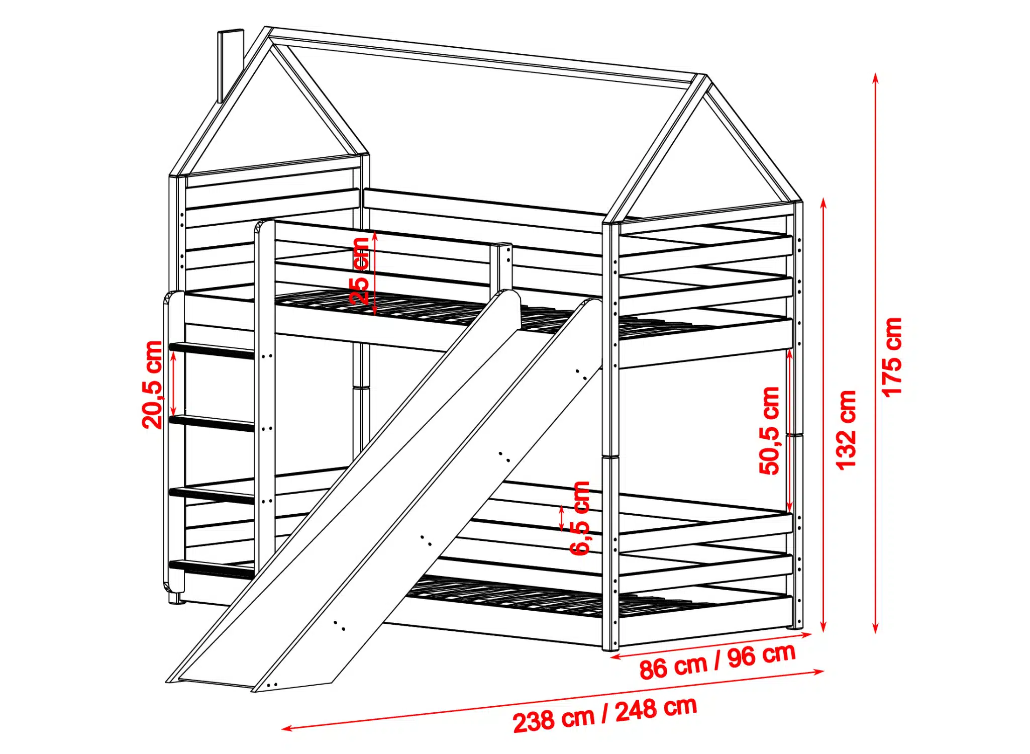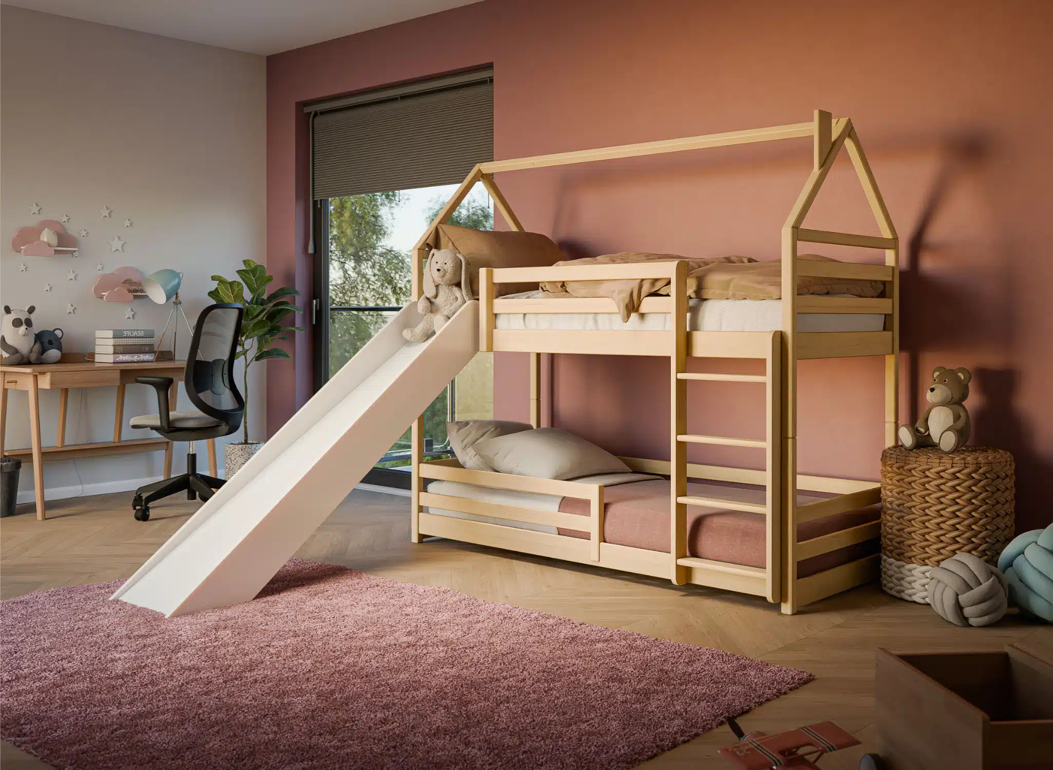 Domčeková posteľ so šmýkačkou PLAY premení izbu vašich detí na skutočne rozprávkový priestor, ktorý pomáha vytvárať krásne okamihy, ktoré zostanú v detskej pamäti navždy. Unikátny vzhľad postele PLAY poskytuje deťom pocit útulnosti a domácich istôt. Takáto poschodová posteľ je snom každého dieťaťa. Pripojená šmýkačka k posteli zabezpečí, že sa deti budú môcť hrať a zostať aktívne aj v daždivých dňoch, napĺňajúc svoju izbu detskou radosťou. Dbáme na to, aby deti mali zabezpečenú bezpečnosť a pohodlie, a preto dolná posteľ postele PLAY nemá nožičky – ideálna pre najmladšie deti. Ďalšia zábrana poskytuje ešte väčšiu ochranu pred pádom. Možnosť personalizácie farby postele vám umožní ľahko prispôsobiť ju každému priestoru.