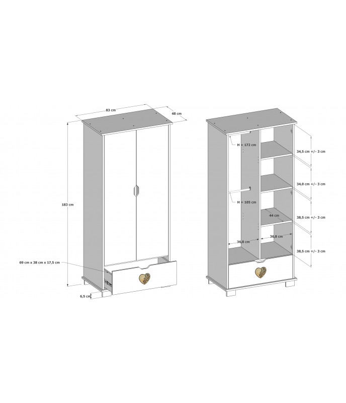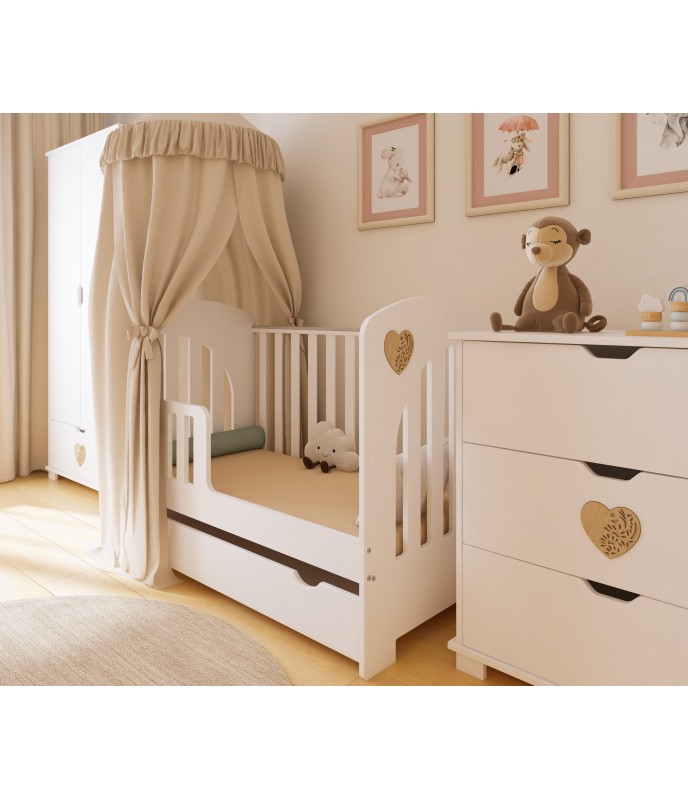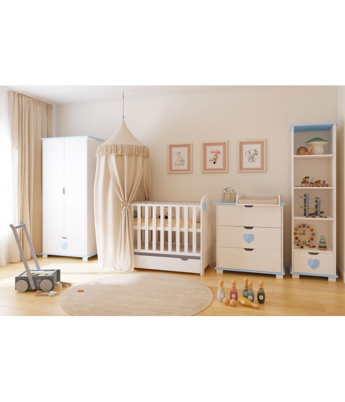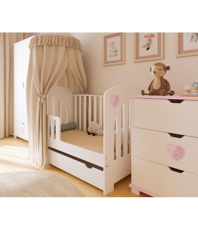 Kolekcia HEART. Vytvorená na rozjasnenie detskej izby! Táto kolekcia s jemnou dekoráciou v tvare srdca a praktickými výrezmi v čelách zásuviek kombinuje moderný dizajn s jednoduchým používaním. Dostupné v troch farebných variantoch: