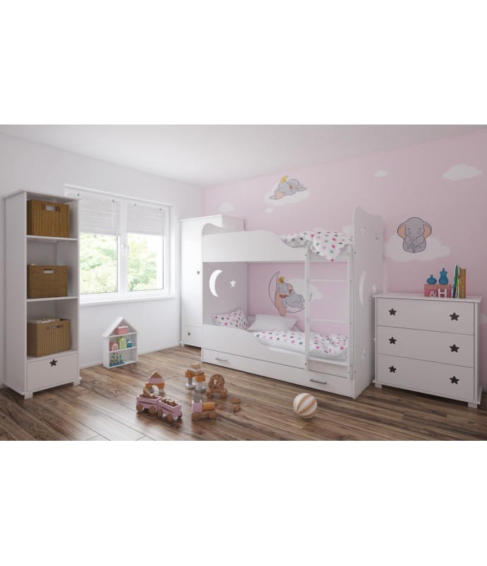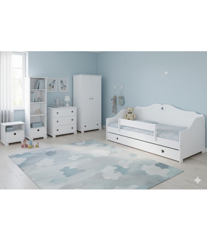 Kolekcia HVIEZDA Kombinuje praktické riešenia s jemným, detským nádychom. Biele predné časti sú zdobené jemnými výrezmi v tvare hviezdy, ktoré slúžia ako dekorácia aj ako úchytka – esteticky príjemné a bez zbytočných vyčnievajúcich prvkov. Nábytok je k dispozícii s vrchnými doskami v piatich farbách, takže ho ľahko zladíte s vaším interiérovým štýlom.