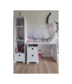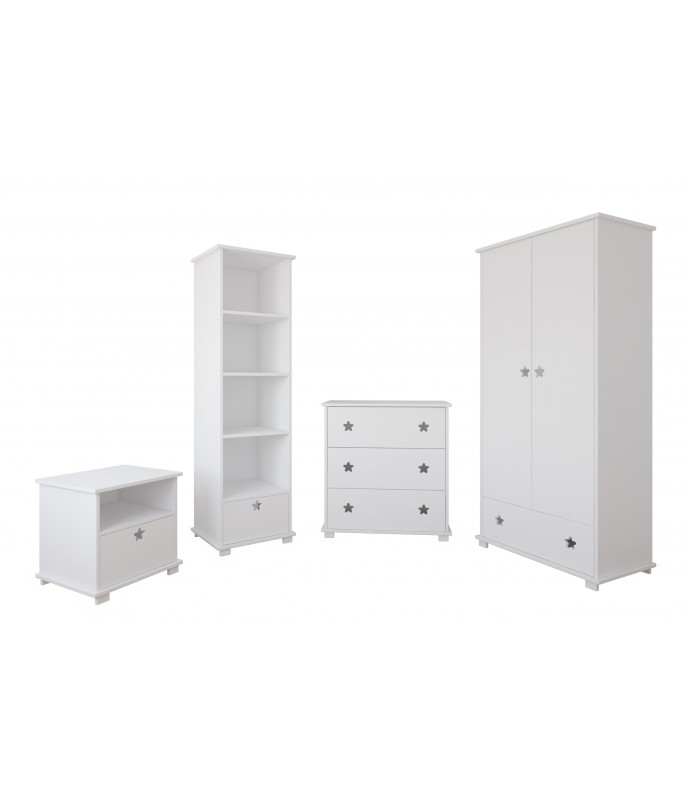 Kolekcia HVIEZDA Kombinuje praktické riešenia s jemným, detským nádychom. Biele predné časti sú zdobené jemnými výrezmi v tvare hviezdy, ktoré slúžia ako dekorácia aj ako úchytka – esteticky príjemné a bez zbytočných vyčnievajúcich prvkov. Nábytok je k dispozícii s vrchnými doskami v piatich farbách, takže ho ľahko zladíte s vaším interiérovým štýlom.