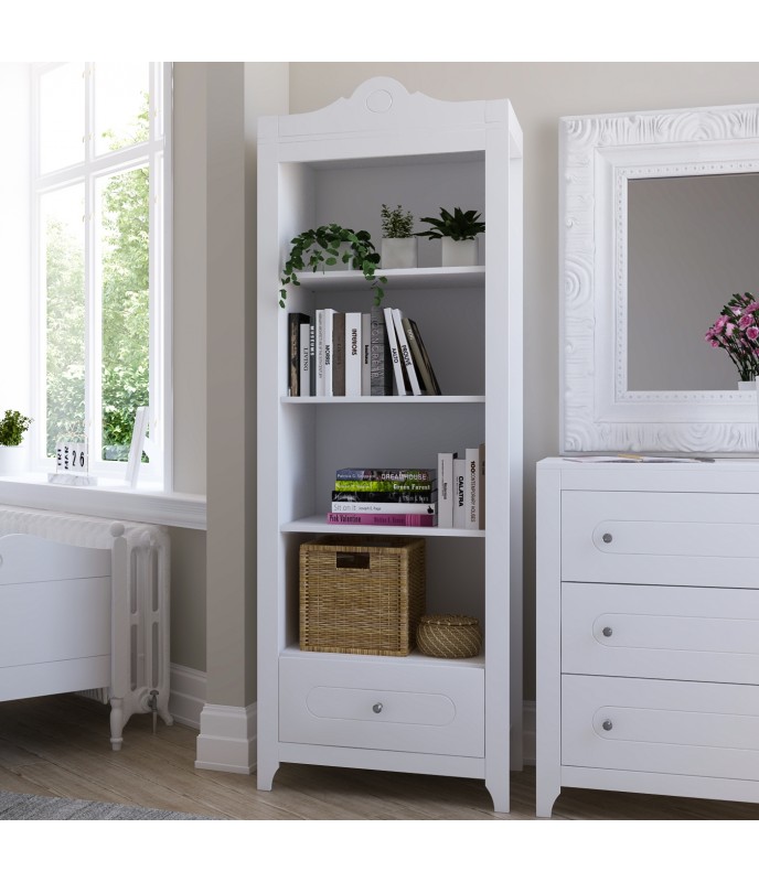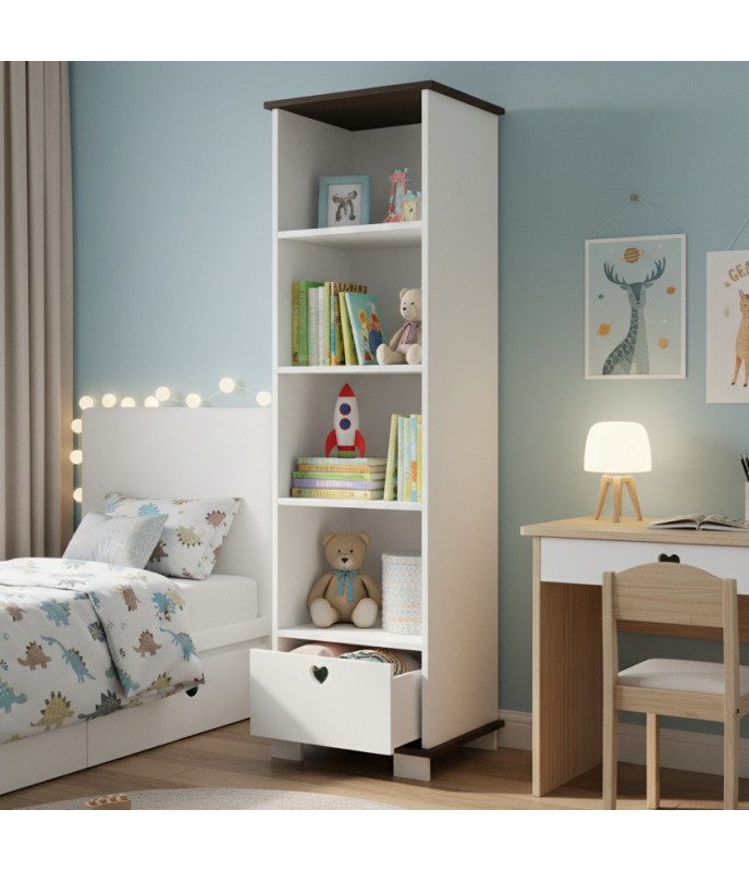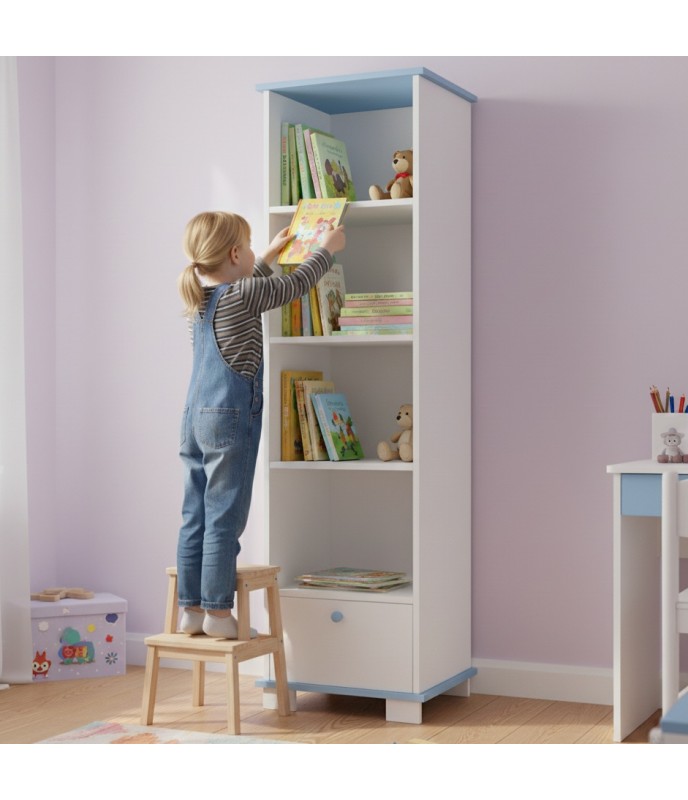 Produkt sa vyznačuje výrazným dizajnom a jednoduchosťou tvarov. Je to efektívny a funkčný spôsob, ako zariadiť interiér v detskej izbe. Knižnica je vyrobená z kvalitnej nábytkovej dosky (trieda I) a surovín v súlade s požadovanými normami. Jeho zaoblené tvary a kvalita materiálu zaisťujú pre malého užívateľa nespochybniteľnú bezpečnosť. Knižnica stojí na štyroch nohách, vďaka čomu je veľmi stabilná a zároveň vám umožní udržiavať čistotu aj na takýchto náročných miestach.