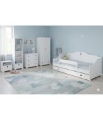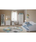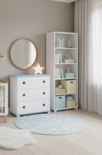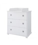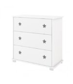 Kolekcia HVIEZDA Kombinuje praktické riešenia s jemným, detským nádychom. Biele predné časti sú zdobené jemnými výrezmi v tvare hviezdy, ktoré slúžia ako dekorácia aj ako úchytka – esteticky príjemné a bez zbytočných vyčnievajúcich prvkov. Nábytok je k dispozícii s vrchnými doskami v piatich farbách, takže ho ľahko zladíte s vaším interiérovým štýlom.
