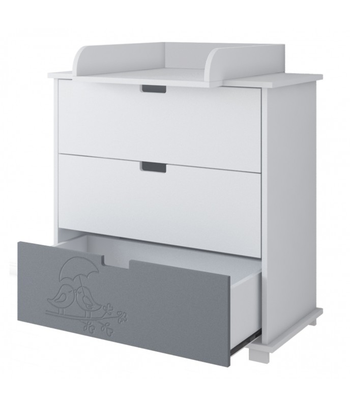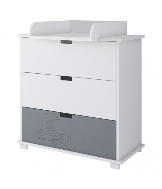 Táto sada detského nábytku kombinuje jednoduchosť a funkčnosť s očarujúcimi, gravírovanými motívmi vtákov. Harmonická kombinácia bielej a sivej robí nábytok univerzálnym – vhodným do chlapčenskej aj dievčenskej izby – a zároveň dodáva interiéru útulný a pokojný pocit.