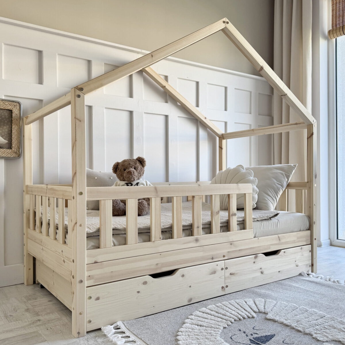 Vďaka jednoduchému, no zároveň pôvabnému dizajnu v tvare domčeka bude táto posteľ perfektným doplnkom každej detskej izby.
