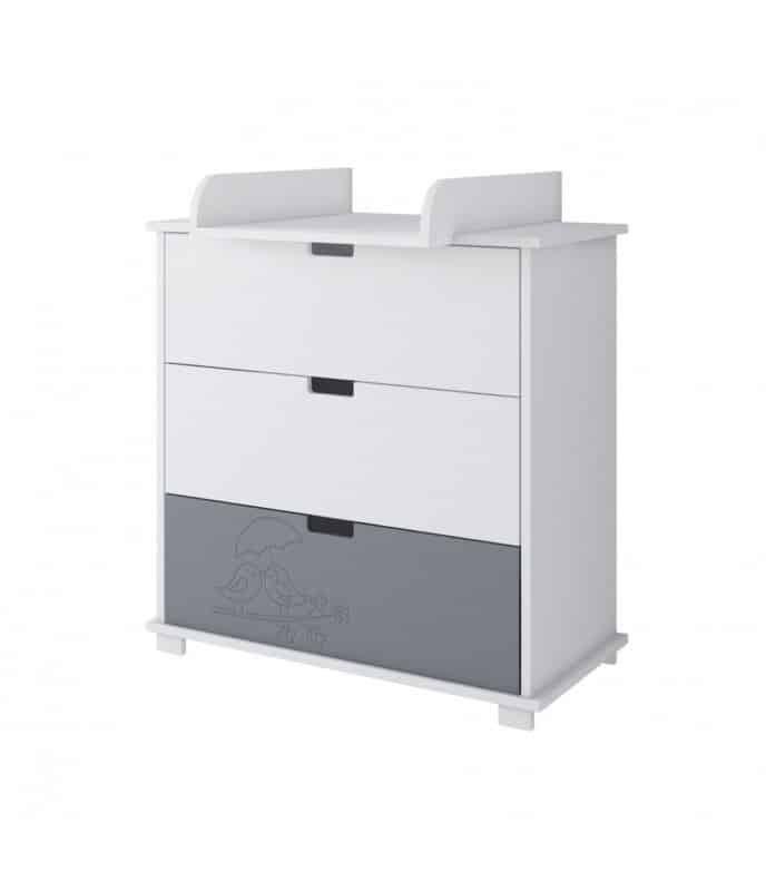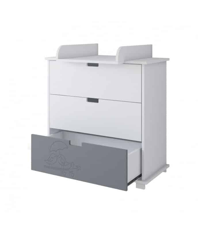 Komoda má tri zásuvky namontované na valčekových vodidlách, umožňujúce jednoduché uloženie detskej šatníkovej skrine. Prídavný prebaľovací pult – rýchlo a jednoducho sa skladá a rozkladá. Aplikuje sa na komodu, má obmedzujúce hrany, ktoré chránia dieťatko pred vypadnutím.