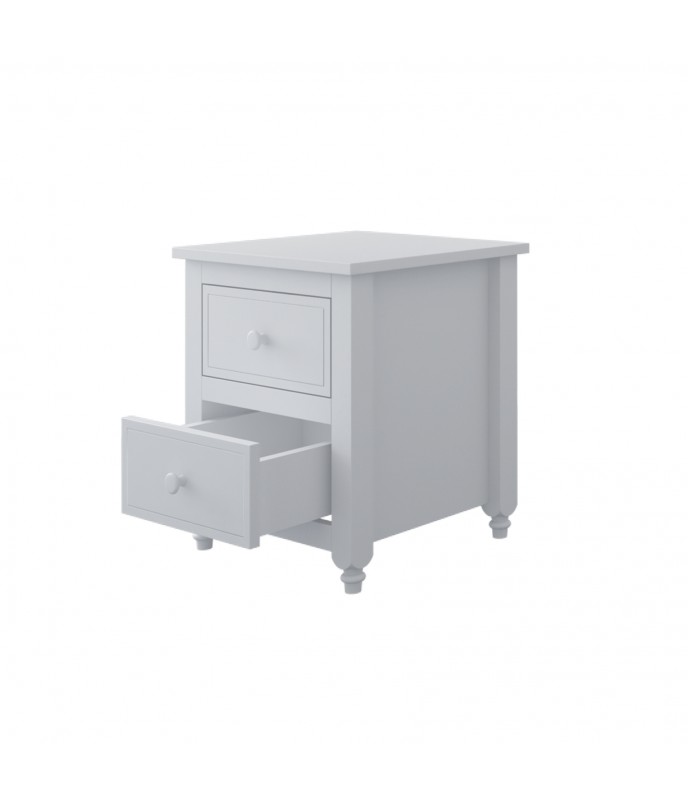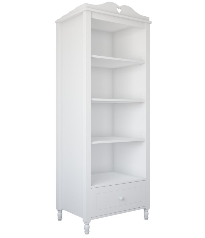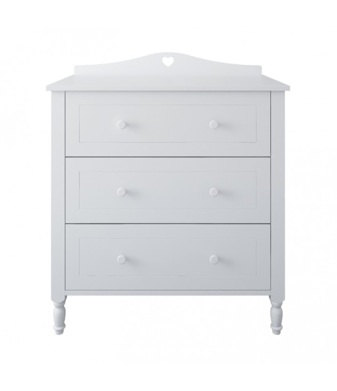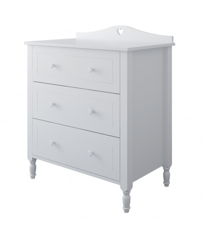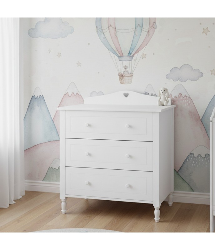Polica je vyrobená z vysoko kvalitnej nábytkovej dosky triedy E1, ktorá spĺňa všetky bezpečnostné normy. Zaoblené hrany a pevná konštrukcia zaisťujú bezpečnosť detí. Dekoratívne čelá s jemnými frézovaniami a sústruženými nohami z masívneho dreva dodávajú nadčasový šarm. Zásuvka na kolieskových vedeniach s bezpečnostnou zarážkou zaisťuje funkčnosť. Vďaka tomu je polica ideálna na uloženie oblečenia a doplnkov a ponúka jednoduchý a pohodlný prístup.