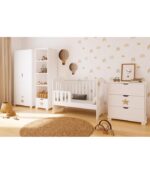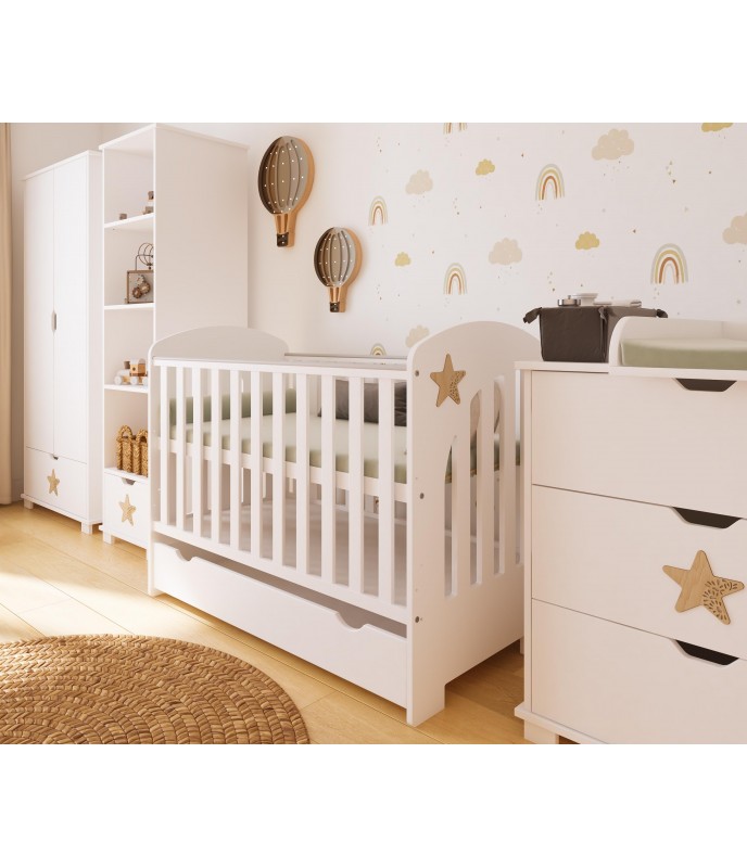 Detská postieľka „STAR“ v rozmere 120×60. Našou prioritou je zabezpečiť bezpečnosť a maximálne pohodlie a komfort pre nášho najmladšieho klienta. Preto majú postieľky 3-stupňovú úroveň nastavenia lôžka, ako aj dve výsuvné priečky. Hryzátko na bočných koľajničkách je ideálne pre štádium prerezávania zúbkov dieťaťa a zaisťuje bezpečnosť proti podráždeniu tvrdými prvkami. Jednoduché použitie, takže ho môžeme ľahko umiestniť na okraj rebríka a ľahko ho odstrániť. Jeho doplnková funkcia sa ľahko udržuje v čistote a je vyrobená z netoxického plastu – úplne bezpečná pre dieťa. V sete s posteľou dostávate OCHRANNÚ ZÁBRANU, vďaka ktorej môžete postieľku prerobiť na gauč. Zábrana sa používa vtedy, keď je dieťa schopné samo vstúpiť do postieľky. Zásuvka namontovaná na valčekových vodidlách pre ľahké uloženie ďalších predmetov. Zásuvka je namontovaná vo vhodnej výške, čo umožňuje pohodlný prístup k posteli, a je zhora zabezpečená doskou, ktorá chráni obsah pred pohľadom a prachom.