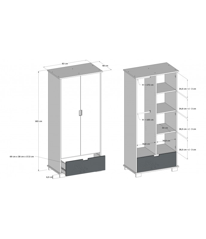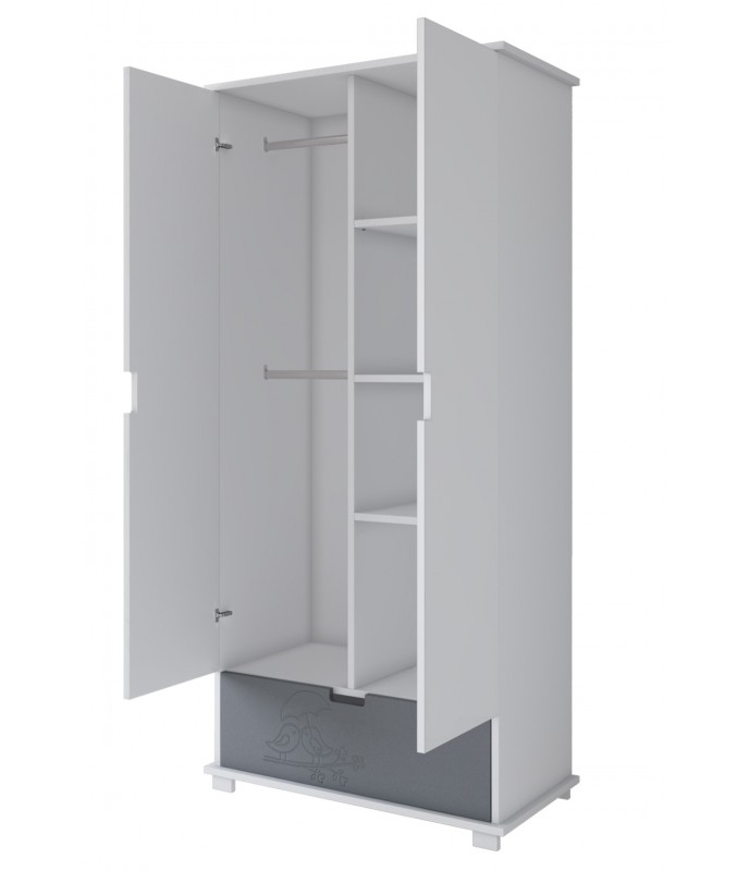 Táto sada detského nábytku kombinuje jednoduchosť a funkčnosť s očarujúcimi, gravírovanými motívmi vtákov. Harmonická kombinácia bielej a sivej robí nábytok univerzálnym – vhodným do chlapčenskej aj dievčenskej izby – a zároveň dodáva interiéru útulný a pokojný pocit.