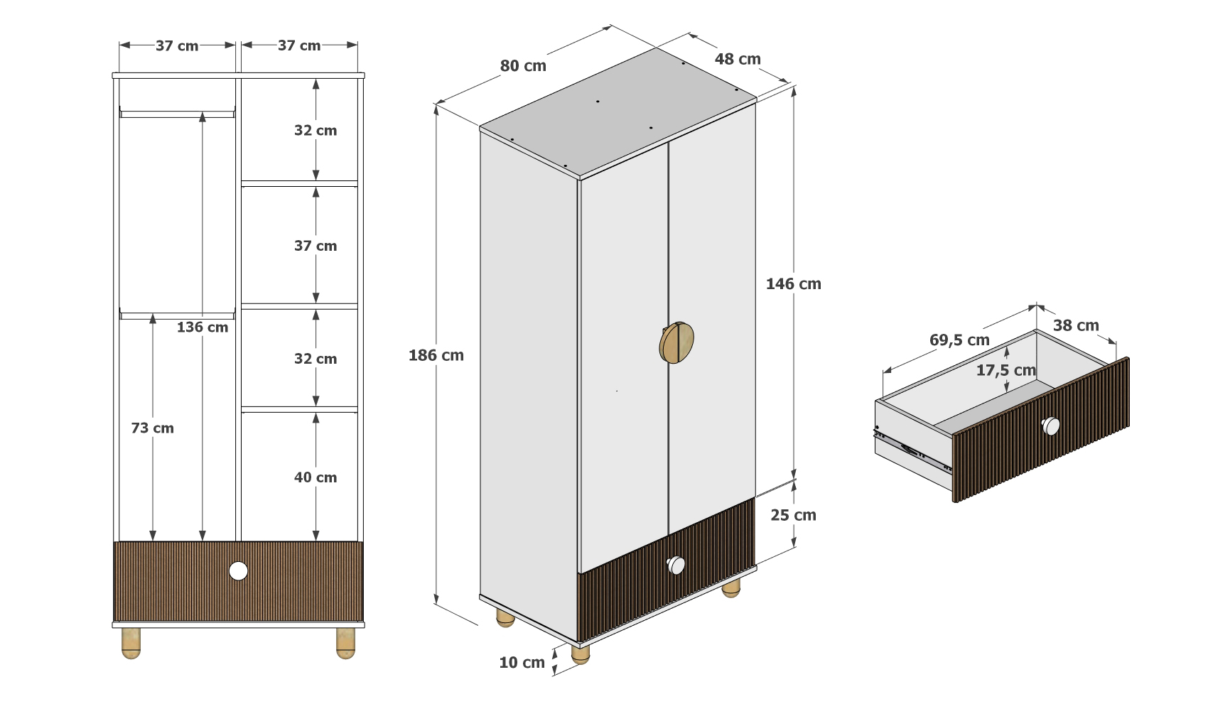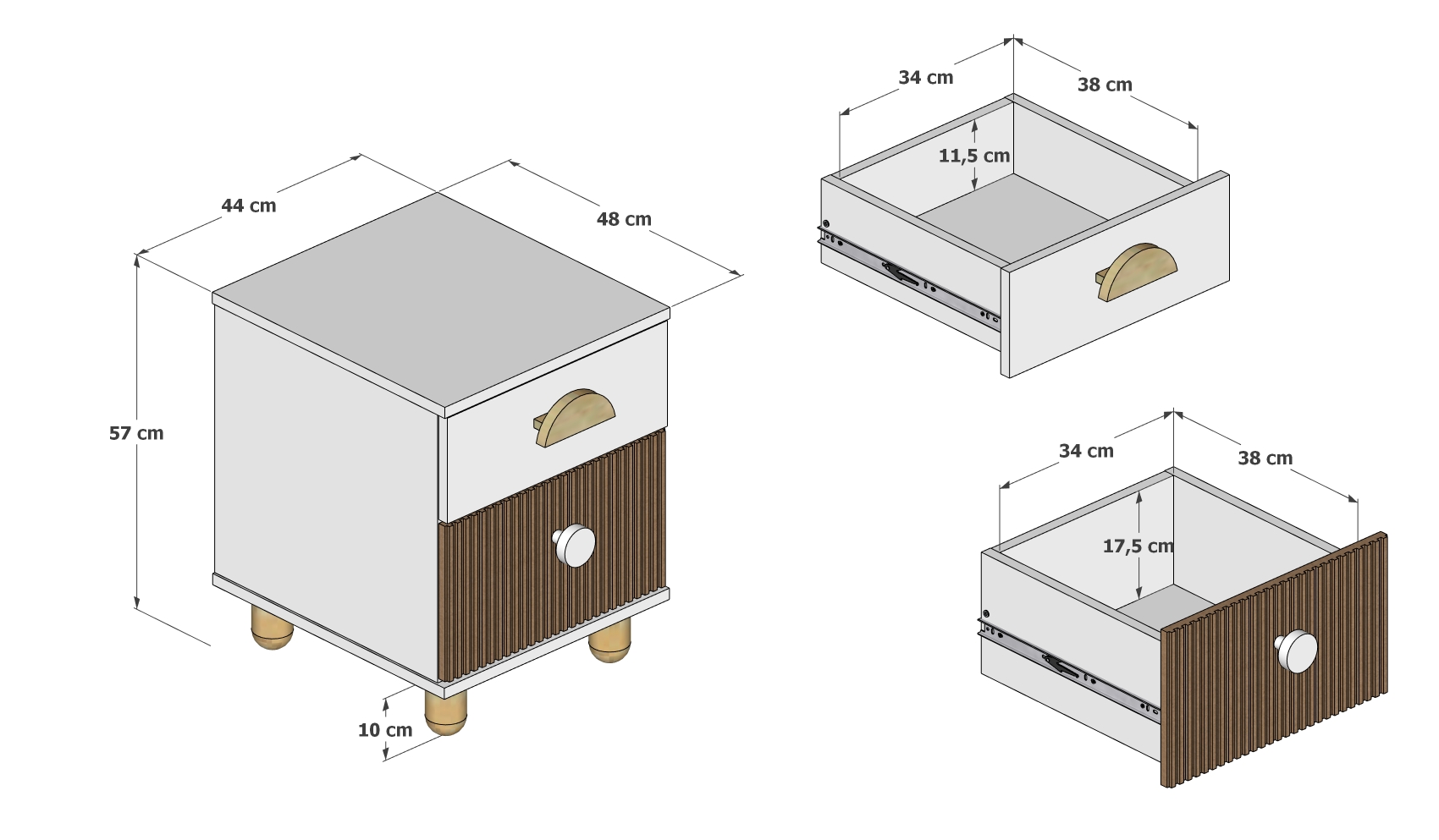 • Korpusy, boky a zadné časti zásuviek: vyrobené z odolnej laminovanej drevotriesky, odolné voči poškriabaniu a ľahko sa čistia.